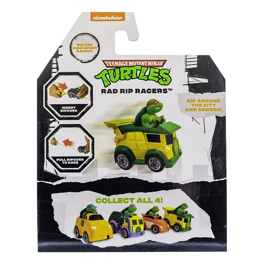 Auta Teenage Mutant Ninja Turtles Rad Rip Racers jsou vyrobena přímo pro závod! Vložte natahovací lanko do vozidla, zatáhněte a sledujte, jak želvy Ninja odjíždějí! K dispozici ve 4 různých modelech. Dejte si rychlý souboj s Leonardem, Michelangelem, Donatellem a Raphaelem. Nasbírejte je úplně všechny! Vhodné pro děti od 4 let.