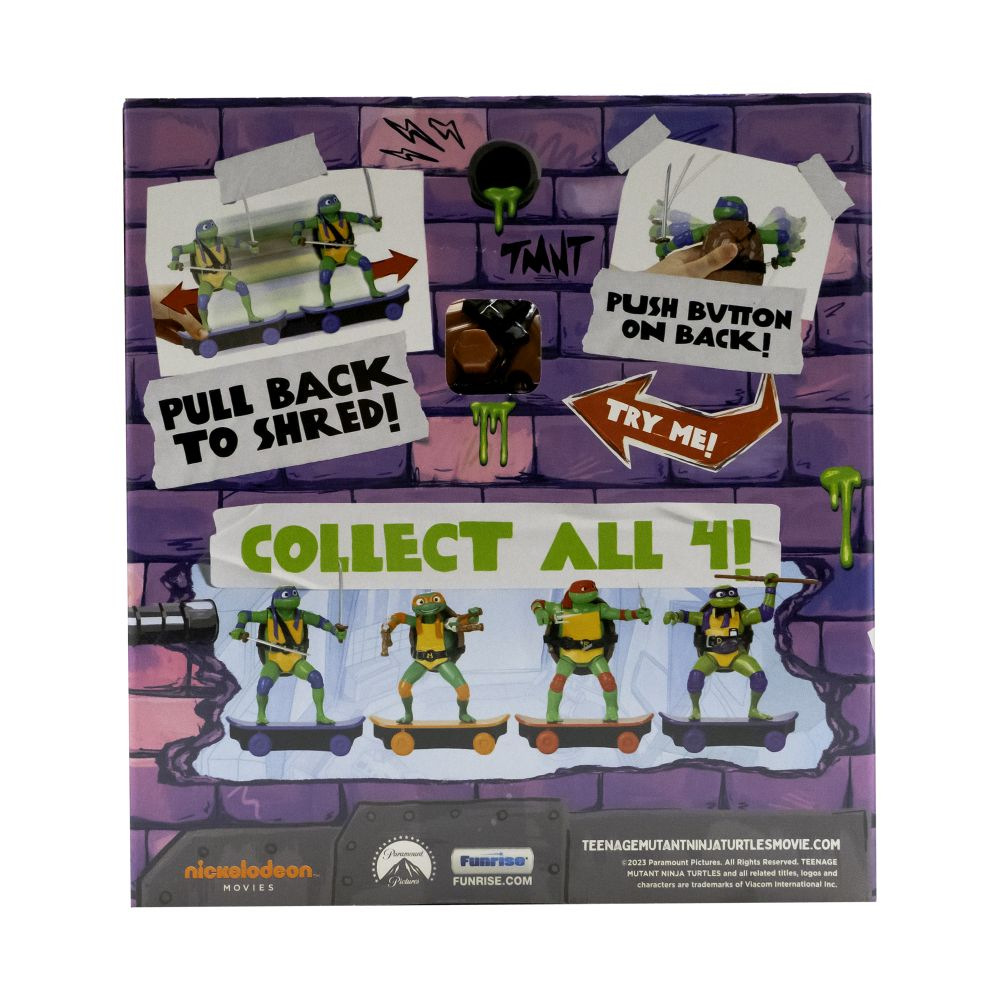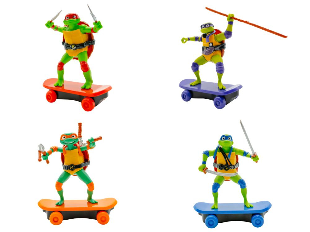 The Teenage Mutant Ninja Turtles jsou cca 13 cm velké želvy na skatech připraveny na boj. Mají typický design oblíbených želv Ninja, které drží svoji ikonickou zbraň. Zatáhněte želvu Ninja dozadu, pusťte ji a sledujte, jak jezdí! Stisknutím tlačítka na krunýři spustíte bojový režim! Nasbírejte všechny 4 postavy! Vhodné pro děti od 3 let.