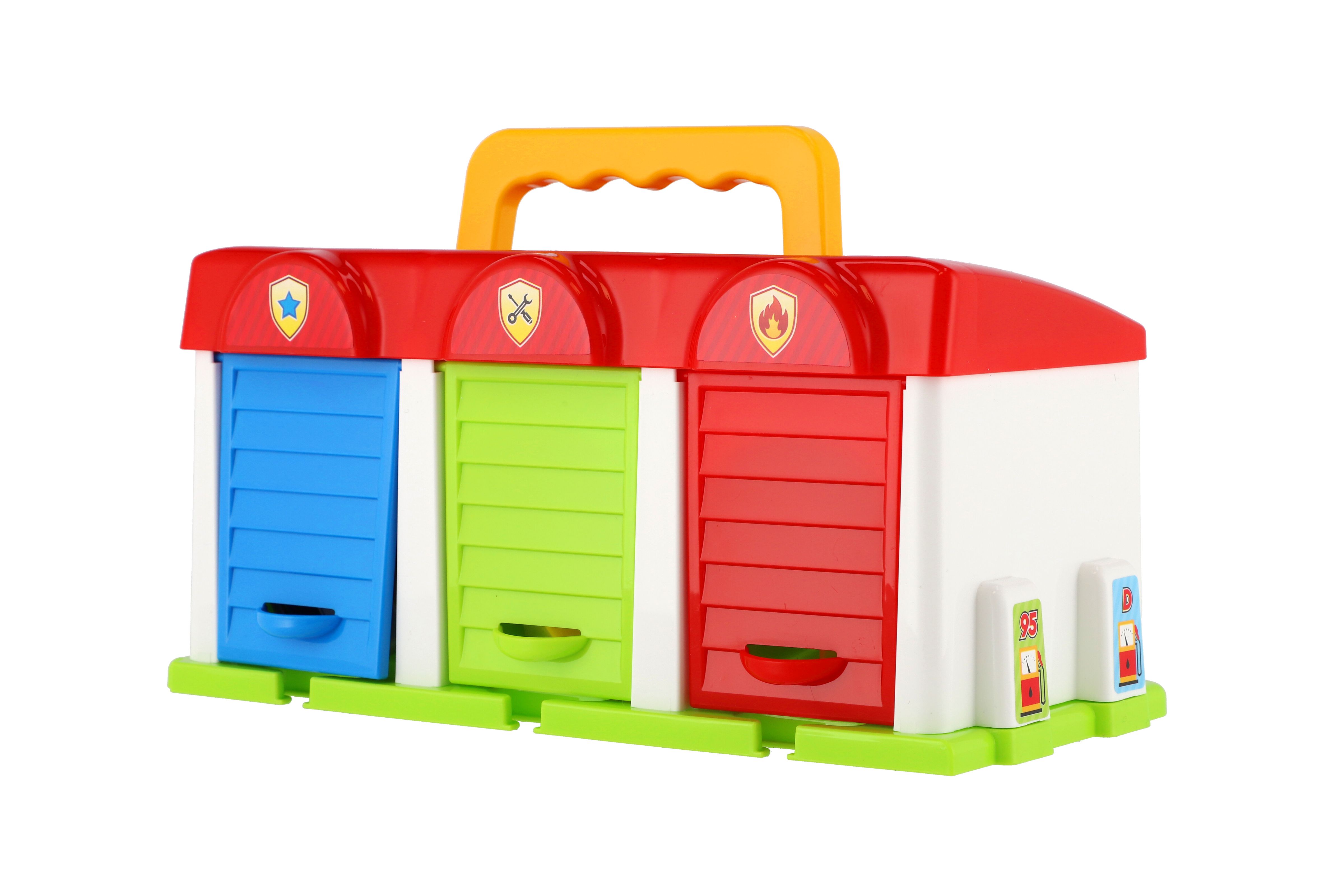 Potřebuješ mít autíčka stále při ruce a v bezpečí? Tato garáž s autíčky a praktickým držátkem je ta pravá! Pod třemi dveřmi se schovávají tři auta - hasiči, osobák a dodávka. V garáži najdete část pro snadnější vjezd a výjezd aut do své kóje. S těmito plastovými autíčky s garáží si užiješ mnoho zábavy! Rozměr krabice: 27 x 14 x 15 cm Vhodné pro děti od 3 let