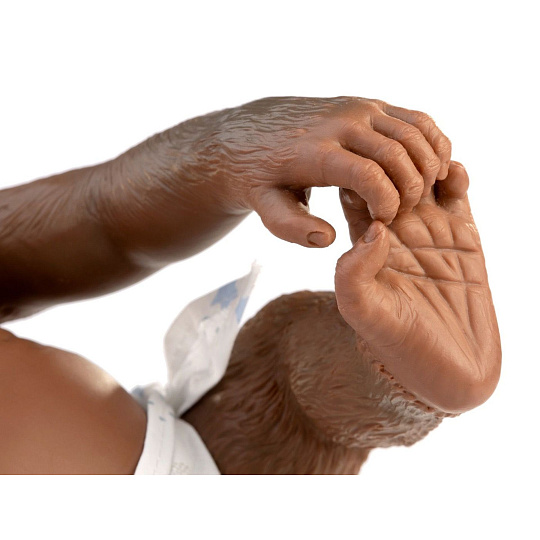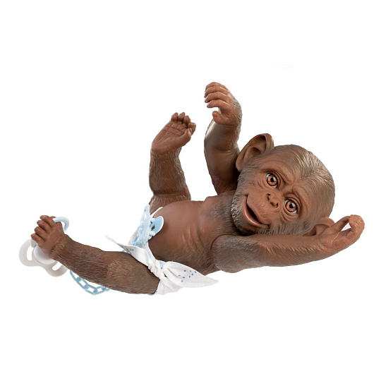 Veselé a roztomilé opičí miminko bez zvuku s vinylovým tělem s možností koupání, na kterém je zachycen věrohodně každý detail tohoto zvířecího mláďátka včetně různých záhybů, kromě pohlaví. Opičku lze koupat, ale je potřeba dát pozor, aby se jí nenamočily řasy. Odlepené řasy nejsou pak důvodem k reklamaci. Ruce a nohy jsou k tělu přichycené kloubem. Opičí miminko je polohovací a může i sedět nebo se dá pověsit za ruce nebo nohy. Dudlík v balení slouží pouze jako doplněk. Velikost 32 cm. Ručně vyrobeno ve Španělsku, baleno v dárkové krabici. Doporučený věk od 3 let.