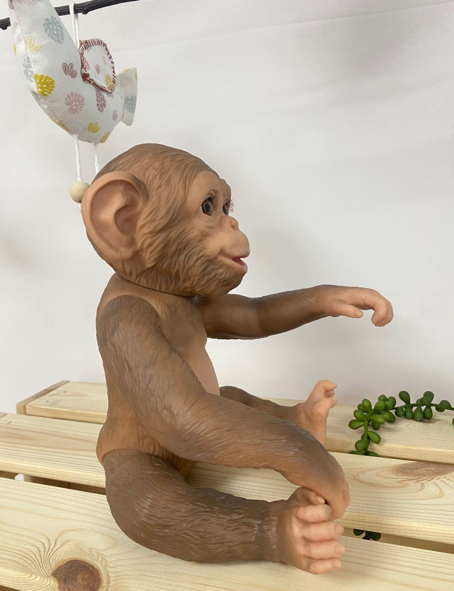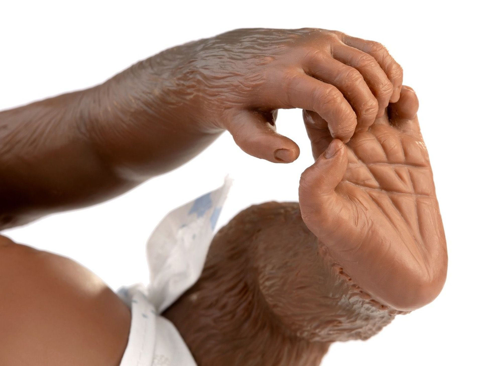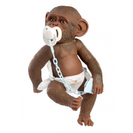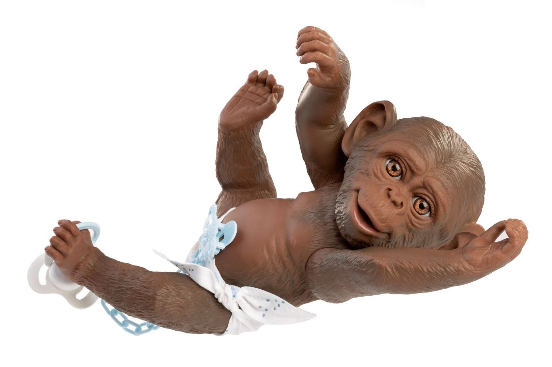 Veselé a roztomilé opičí miminko bez zvuku s vinylovým tělem s možností koupání, na kterém je zachycen věrohodně každý detail tohoto zvířecího mláďátka včetně různých záhybů, kromě pohlaví. Opičku lze koupat, ale je potřeba dát pozor, aby se jí nenamočily řasy. Odlepené řasy nejsou pak důvodem k reklamaci. Ruce a nohy jsou k tělu přichycené kloubem. Opičí miminko je polohovací a může i sedět nebo se dá pověsit za ruce nebo nohy. Dudlík v balení slouží pouze jako doplněk. Velikost 32 cm. Ručně vyrobeno ve Španělsku, baleno v dárkové krabici. Doporučený věk od 3 let.