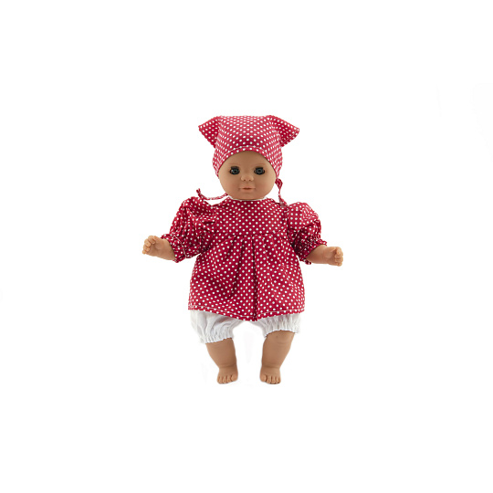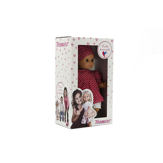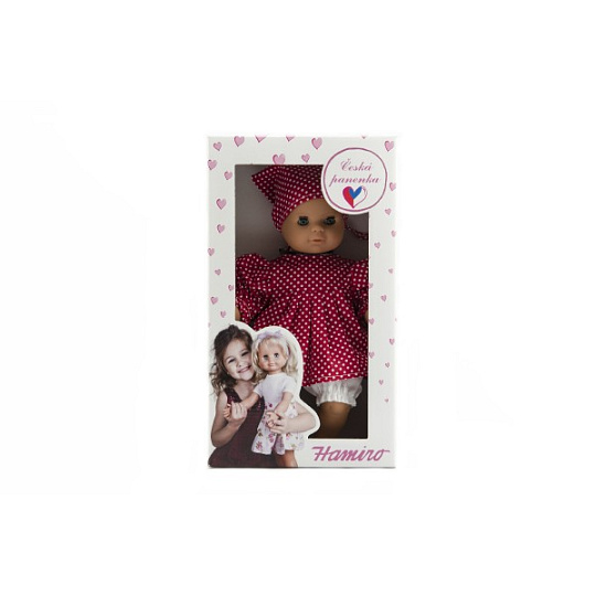 Hamiro Panenka/Miminko 30cm, látkové tělo šaty červené+ bílý puntík + šátek v krabici 20x35x13cm