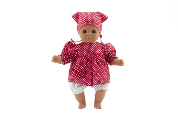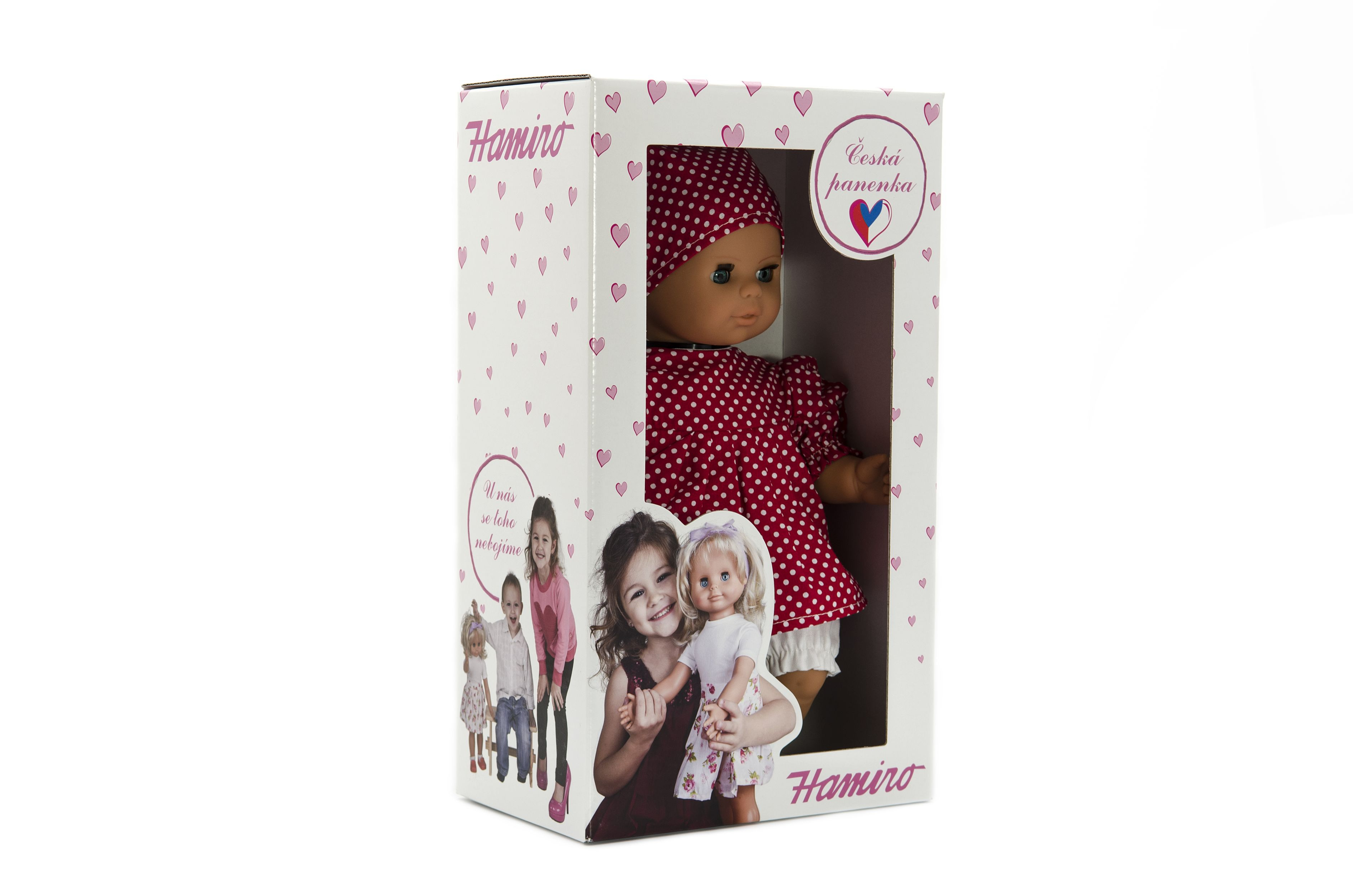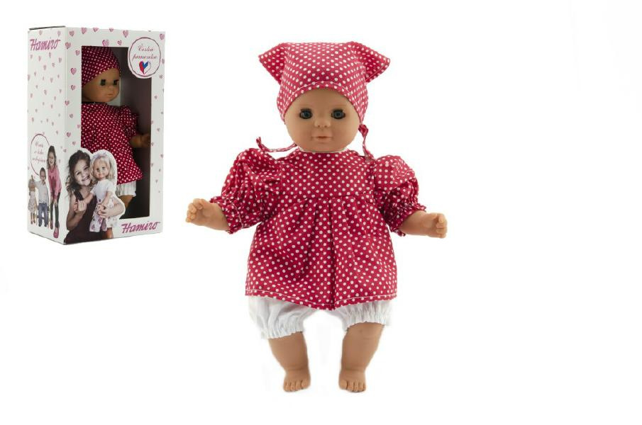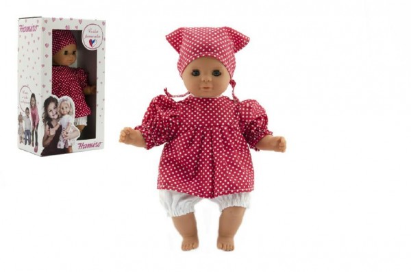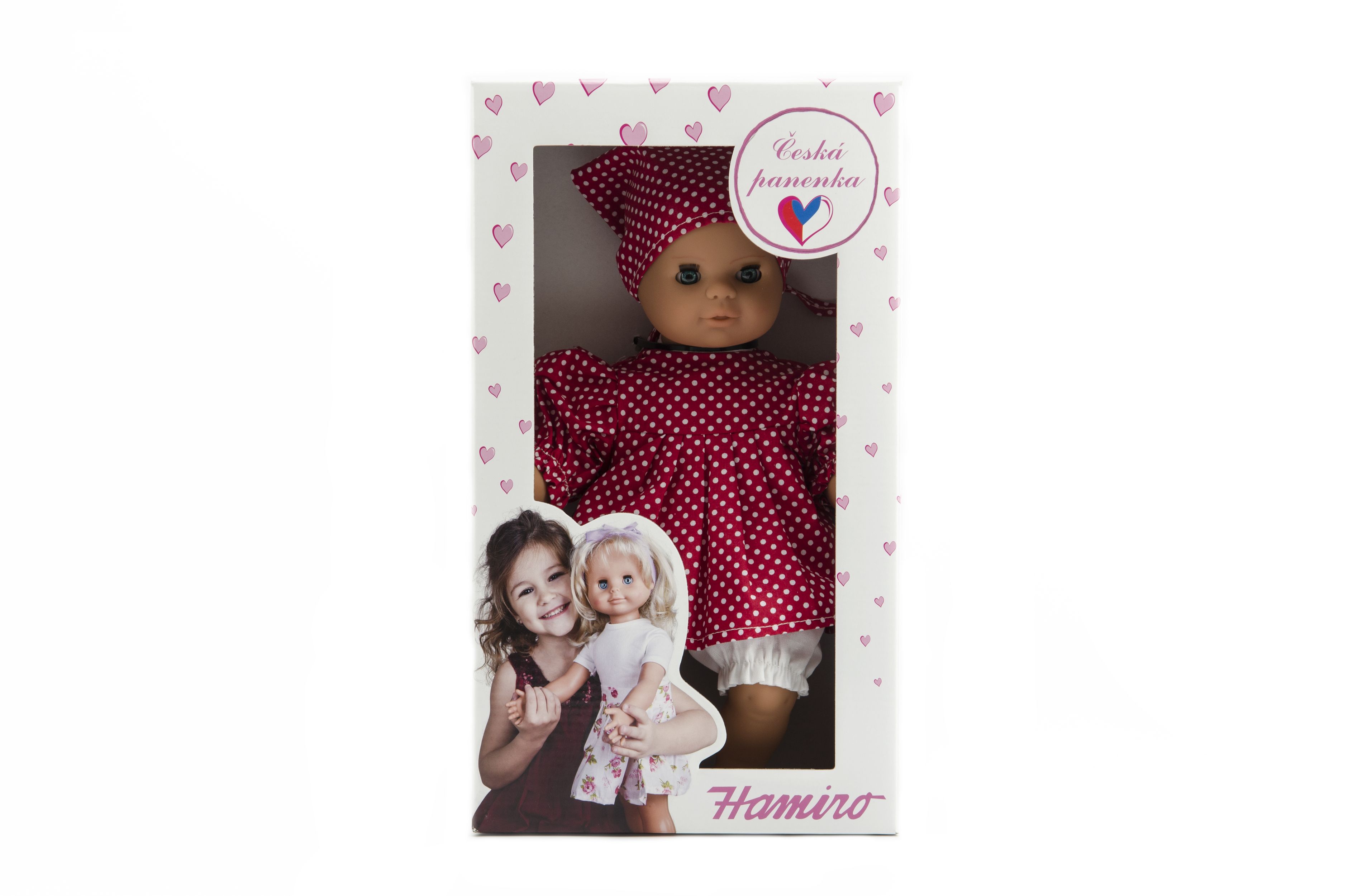 Hamiro Panenka/Miminko 30cm, látkové tělo šaty červené+ bílý puntík + šátek v krabici 20x35x13cm