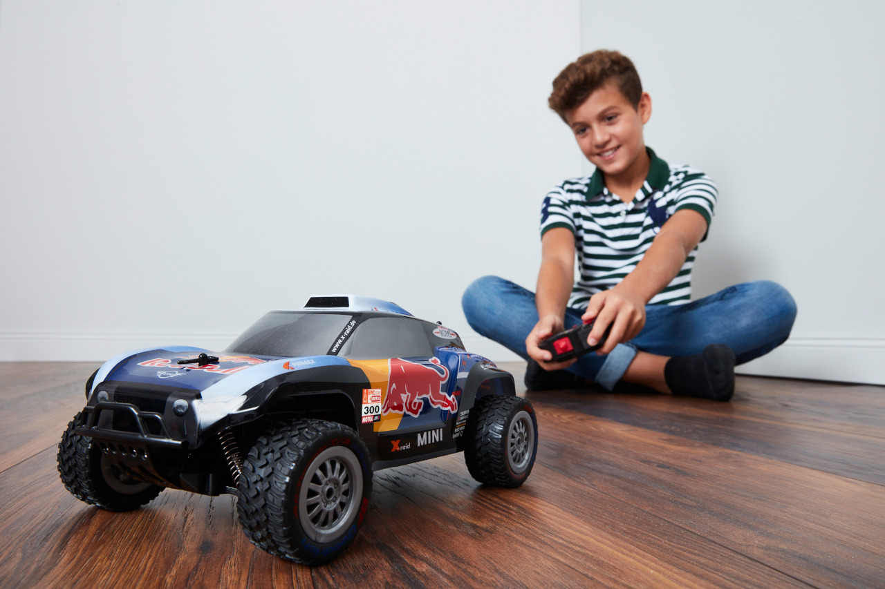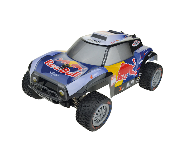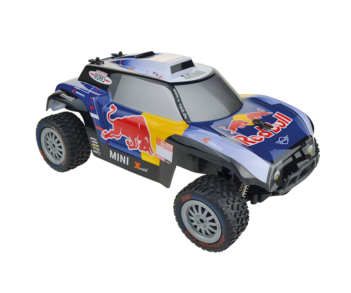 Dvoukanálový model auta na dálkové ovládání X-Raid MINI JCW Buggy Red Bull 1:16, frekvence 2,4 GHz. Může jezdit až 10 závodníků najednou. 30,5 x 11,5 x 17 cm.\nNa baterie auto 4 x LR6 AA (1,5V), ovladač 1x 6LF22 (9V).