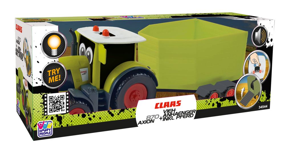 Traktor Class Kids s přepravníkem pro zvířata včetně koně. Traktor vydává zvuk motoru a obsahuje světelnou funkci majáku. Přepravík má otevíratelnu zadní chlopeň a je dlouhý cca 28 cm. Baterie jsou součástí balení. Vhodné pro děti od 12 měsíců.