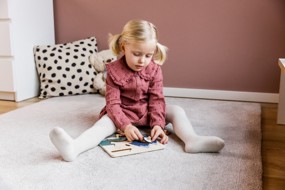 Dřevěná skládačka podporuje jemnou motoriku a hravé učení koordinace ruka-oko. S láskou navržené puzzle se skládá z dřevěné desky a s tvary na dílky skládačky v podobě zvířátek. Díky praktickým knoflíkům vaše dítě snadno uchopí každý kousek. Uchopením a přilepením dílků na místo vaše dítě vytvoří zvířátko a zároveň trénuje tvary, paměť, jemnou motoriku, koordinaci oko-ruka a koncentraci. Udržitelná hračka je vyrobená ze dřeva s certifikací FSC®. Vhodné pro děti od 1 roka.