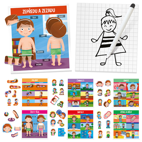 Obsah balení: 7 tabulek „Objevujeme lidské tělo“ v českém jazyce, 42 tvarovaných výseků, 1 prázdná tabulka, 1 mazatelné pero