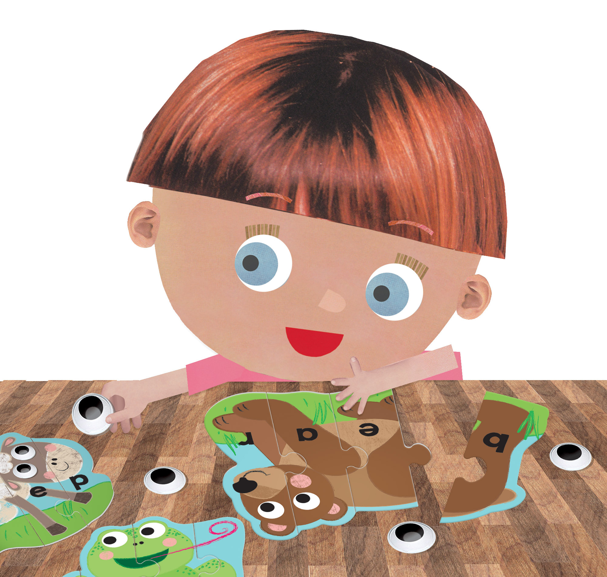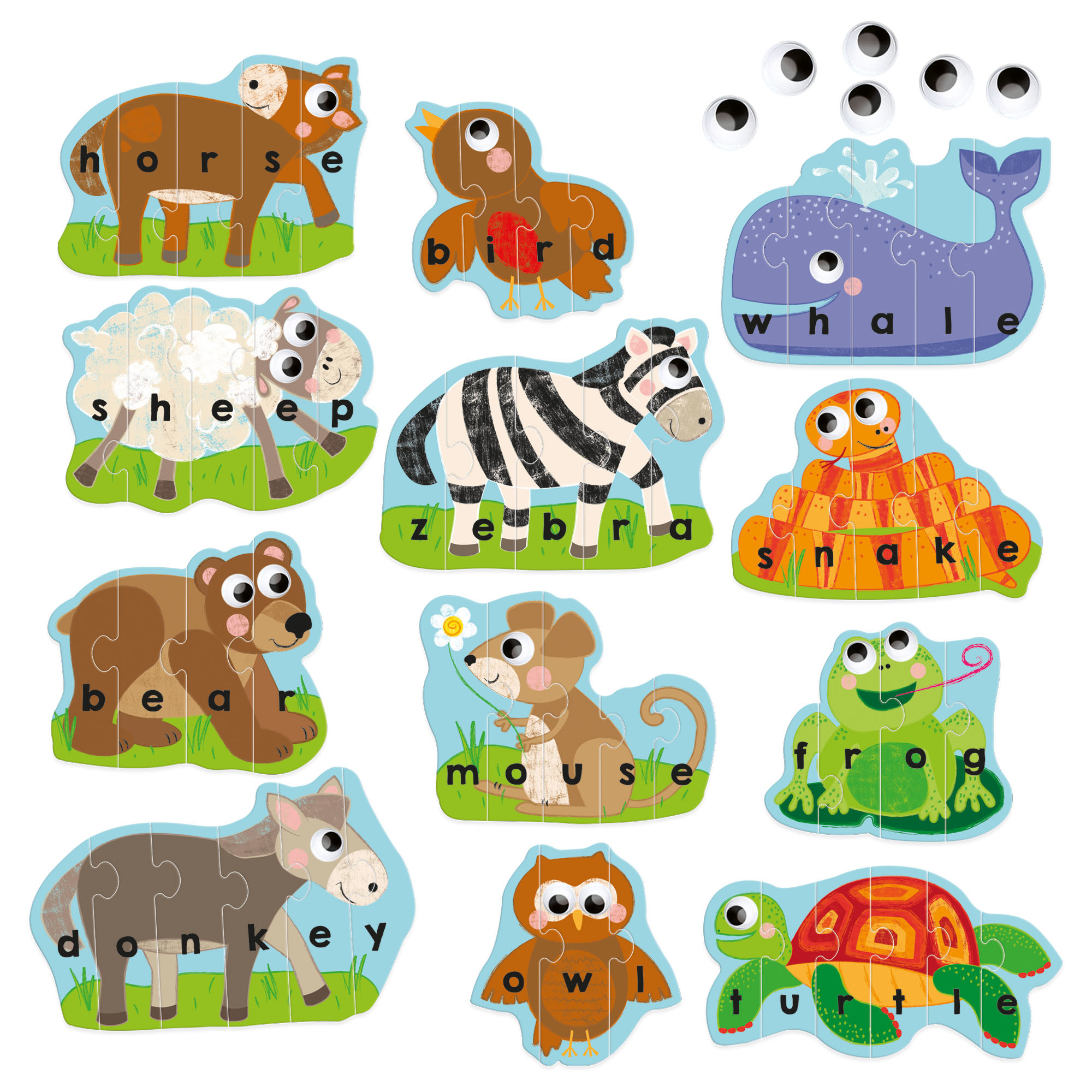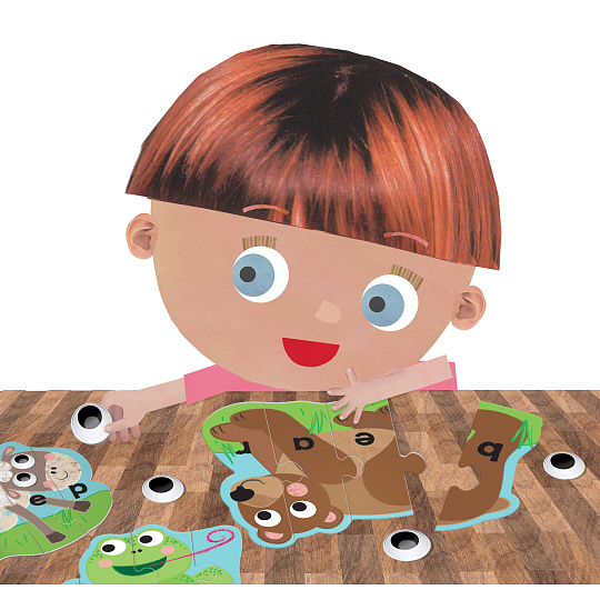 Sestavte dohromady samo-opravné puzzle a naučte se, jak číst a psát svá první slova. Navíc můžete vylepšit a oživit zvířátka přidáním nalepovacích očí.