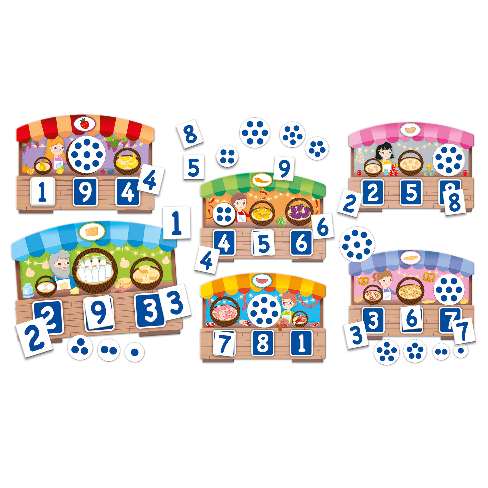Obsah balení: 6 herních desek bingo s různými stánky a nabízenými druhy zboží, 18 obdélníkových dílků s čísly, 18 kulatých dílků se symboly množství, sáček z organické bavlny, průvodce výukou