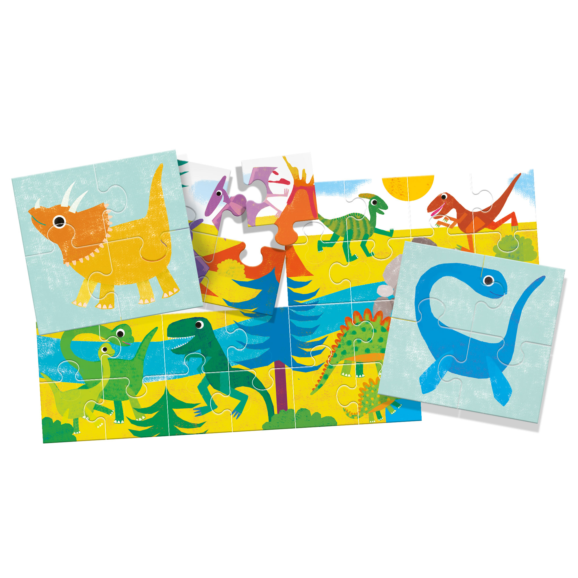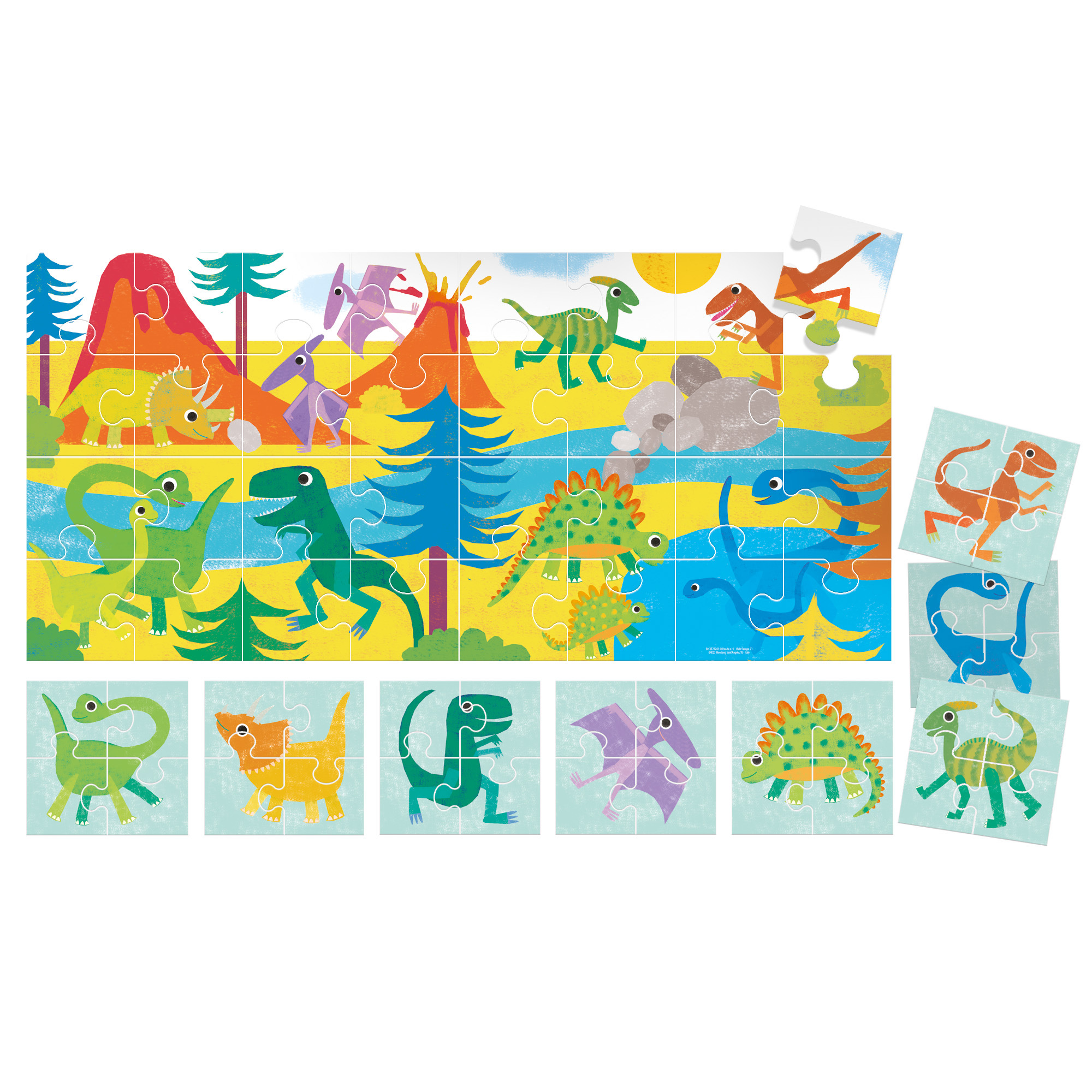 Velké, oboustranné a super odolné dílky určené ke hře a objevování. S dílky otočenými na jednu stranu mohou děti sestavit 8 rozkošných dinosaurů, každého vytvořeného ze 4 dílků, a po otočení dílků na druhou stranu sestaví atraktivní scénu z pravěku.