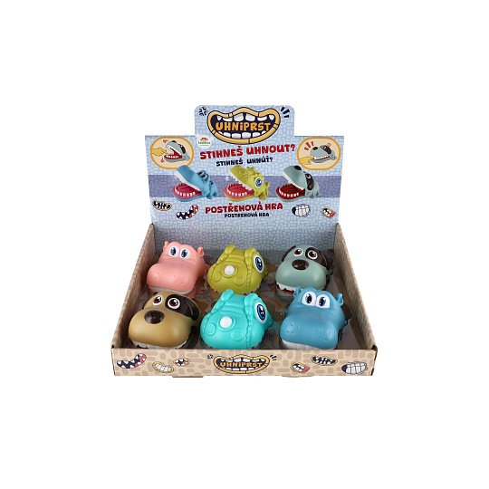 Zábavná postřehová hra zvířecí zuby, kdy zvířátko otevře tlamu a děti se střídají a postupně zatlačují jeho zuby. V určitý moment zvířátko tlamu zaklapne. Ten, koho zvířátko nekousne, vyhrává. Rozměr hračky: 12 x 6 cm Vhodné pro děti od 3 let.