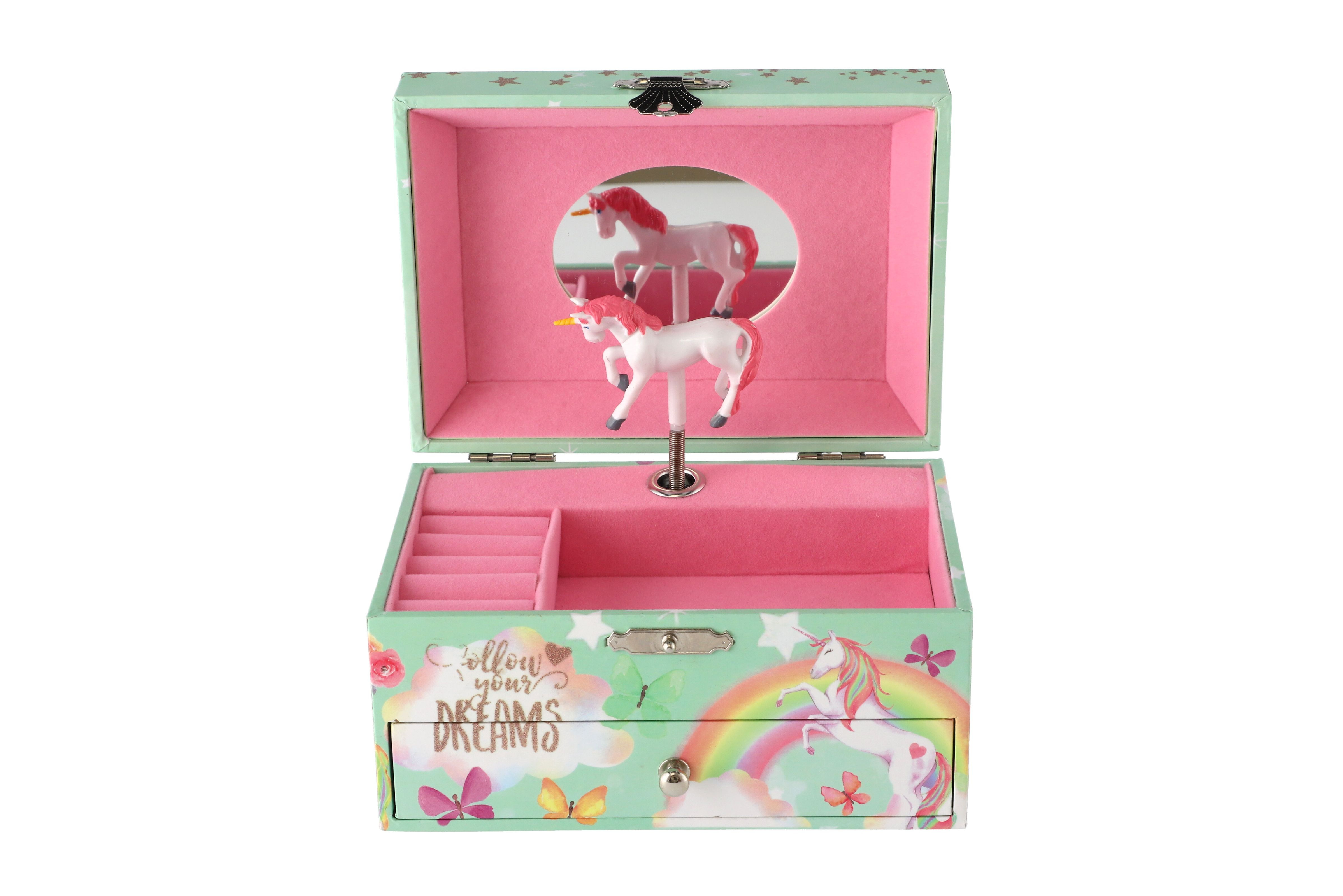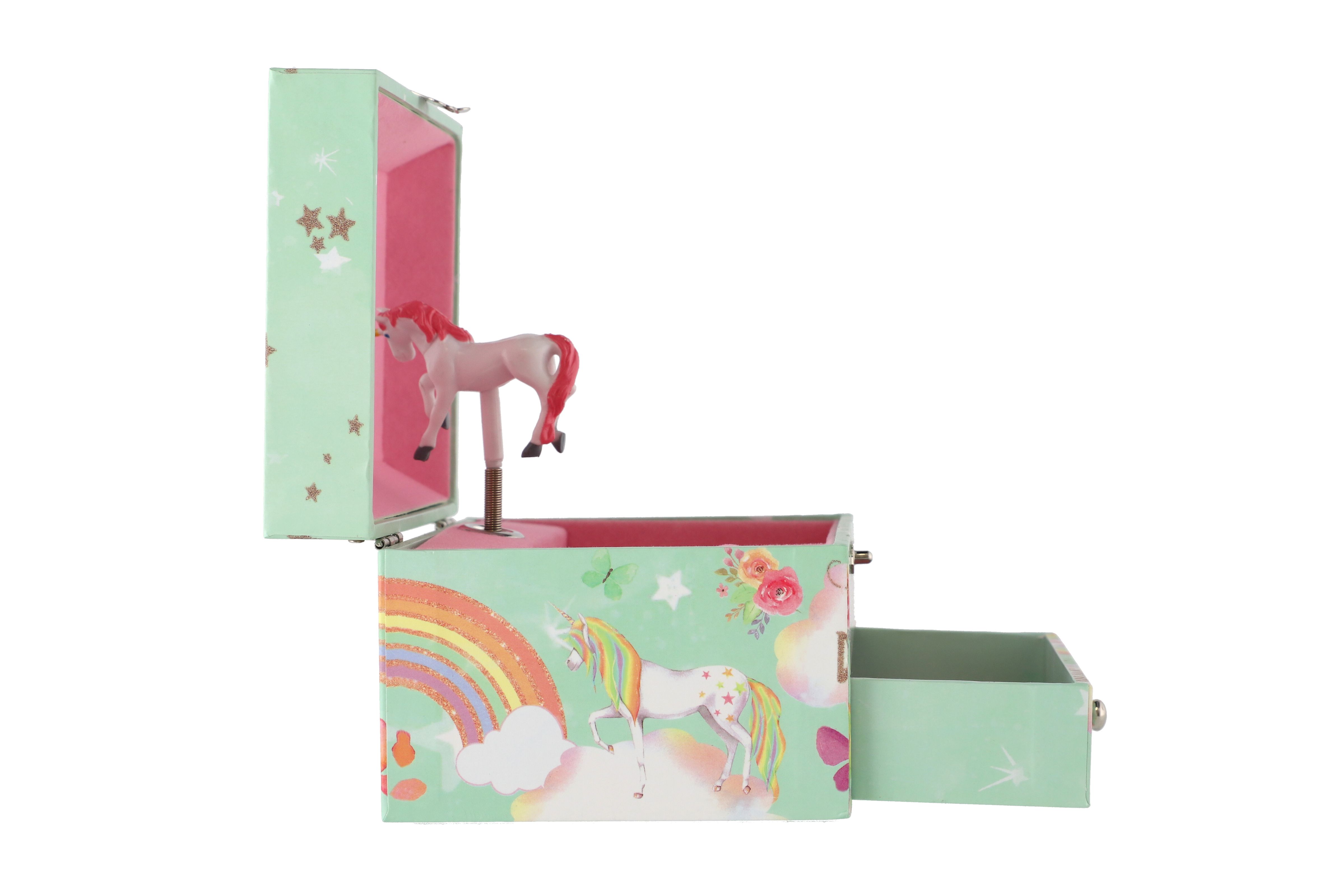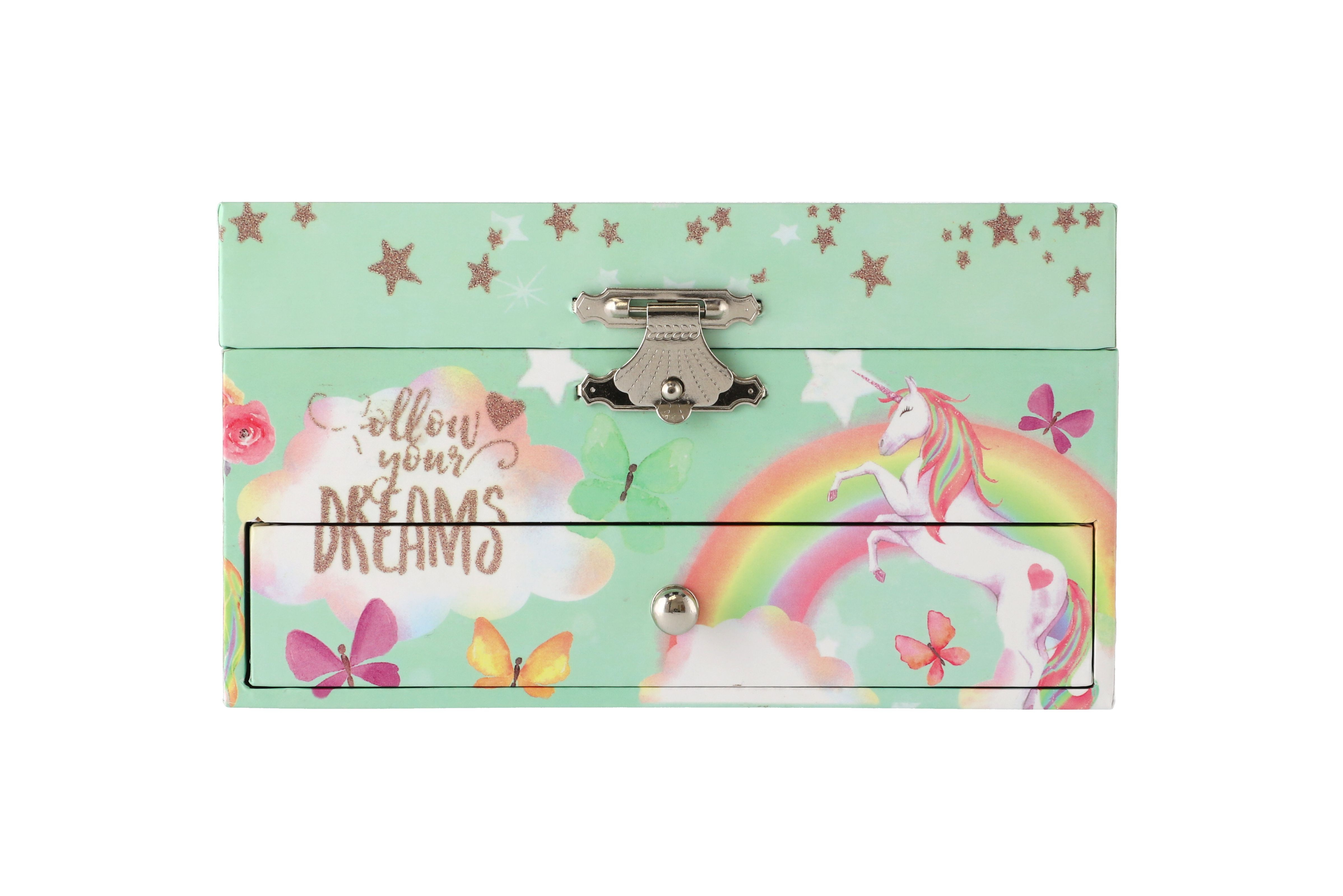 Tato kazeta s hrací skříňkou je stylizovaná na šperkovnici a bude ideálním místem pro uložení pokladů každé dívky. Kazeta je vyrobena z odolného kartonu v pastelově zelené barvě, a je zdobena hvězdami a motivem jednorožce, což z něj dělá ideální doplněk pro dětský pokoj. Kazeta má kovová, postříbřená držadla a pevné závěsy. Pod krytem se zrcadlem je prostor pro pořádání suvenýrů nebo šperků. Také zde je bílo-růžový jednorožec, který se po natažení klíčku točí a hraje. Pod nimi je malá zásuvka pro další podrobnosti. Hrací skříňku se zapíná pomocí růžovo bílého poníka připojeného k sadě. Rozměr šperkovnice: 16 x 10 x 12 cm Není hračka