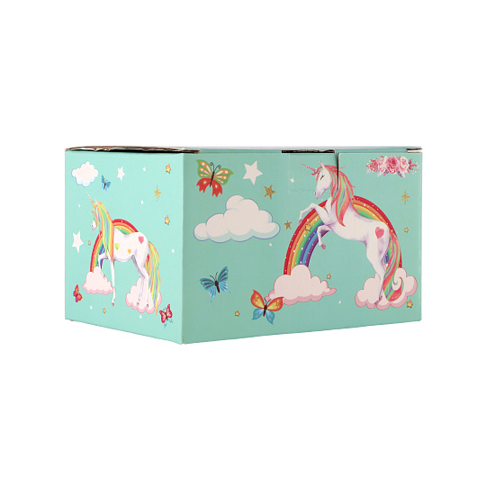 Tato kazeta s hrací skříňkou je stylizovaná na šperkovnici a bude ideálním místem pro uložení pokladů každé dívky. Kazeta je vyrobena z odolného kartonu v pastelově zelené barvě, a je zdobena hvězdami a motivem jednorožce, což z něj dělá ideální doplněk pro dětský pokoj. Kazeta má kovová, postříbřená držadla a pevné závěsy. Pod krytem se zrcadlem je prostor pro pořádání suvenýrů nebo šperků. Také zde je bílo-růžový jednorožec, který se po natažení klíčku točí a hraje. Pod nimi je malá zásuvka pro další podrobnosti. Hrací skříňku se zapíná pomocí růžovo bílého poníka připojeného k sadě. Rozměr šperkovnice: 16 x 10 x 12 cm Není hračka