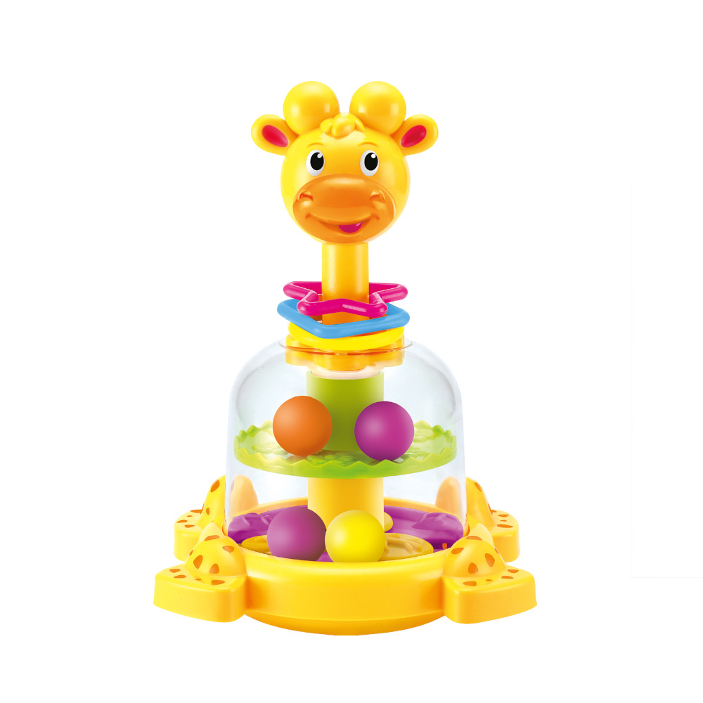 Pestrobarevný mechanický kolotoč ve tvaru žirafy je naplněný barevnými kuličkami, které budou po zmáčknutí hlavy rotovat, skákat a vydávat chrastící zvuk.Tato hračka zaujme a pobaví i ty nejmenší děti.
