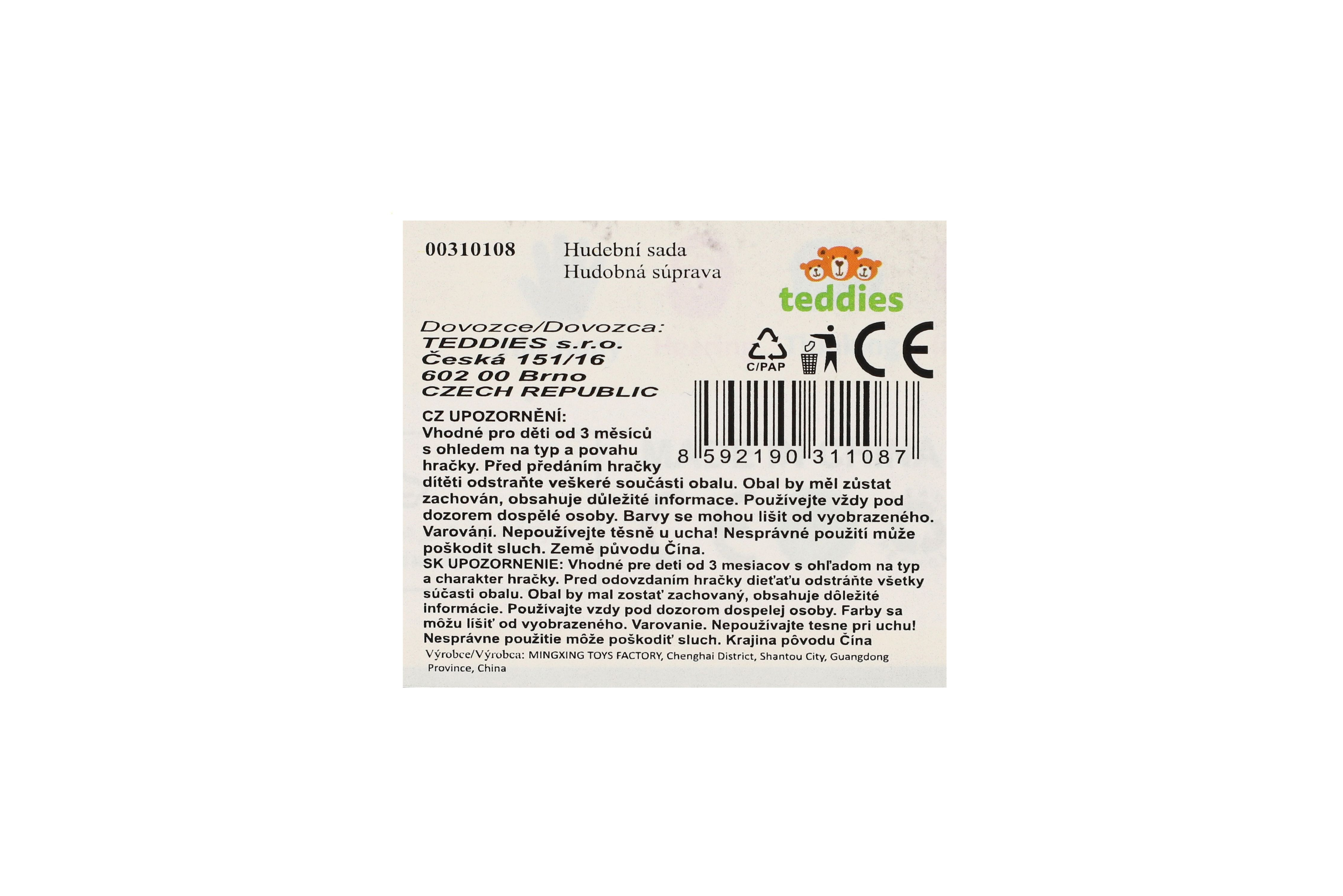 Zabavte své děti se sadou hudebních nástrojů s roztomilým dinosaurem. Tato sada je skvělým způsobem, jak jim představit svět hudby a kreativity. Sada obsahuje: bubínek, rumba koule, tamburínku a trumpetu. Rozměr balení: 27,5 x 28 cm Vhodné pro děti od 3 měsíců