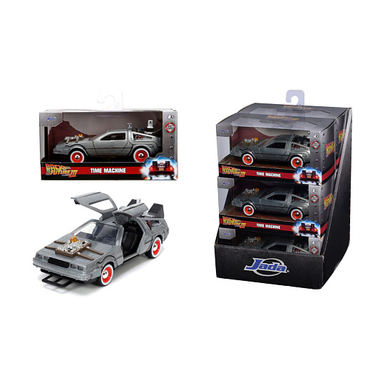 Kovový model Time Machine Back to the Future 3 na volnoběh v měřítku 1:32 s otevíracími dveřmi.