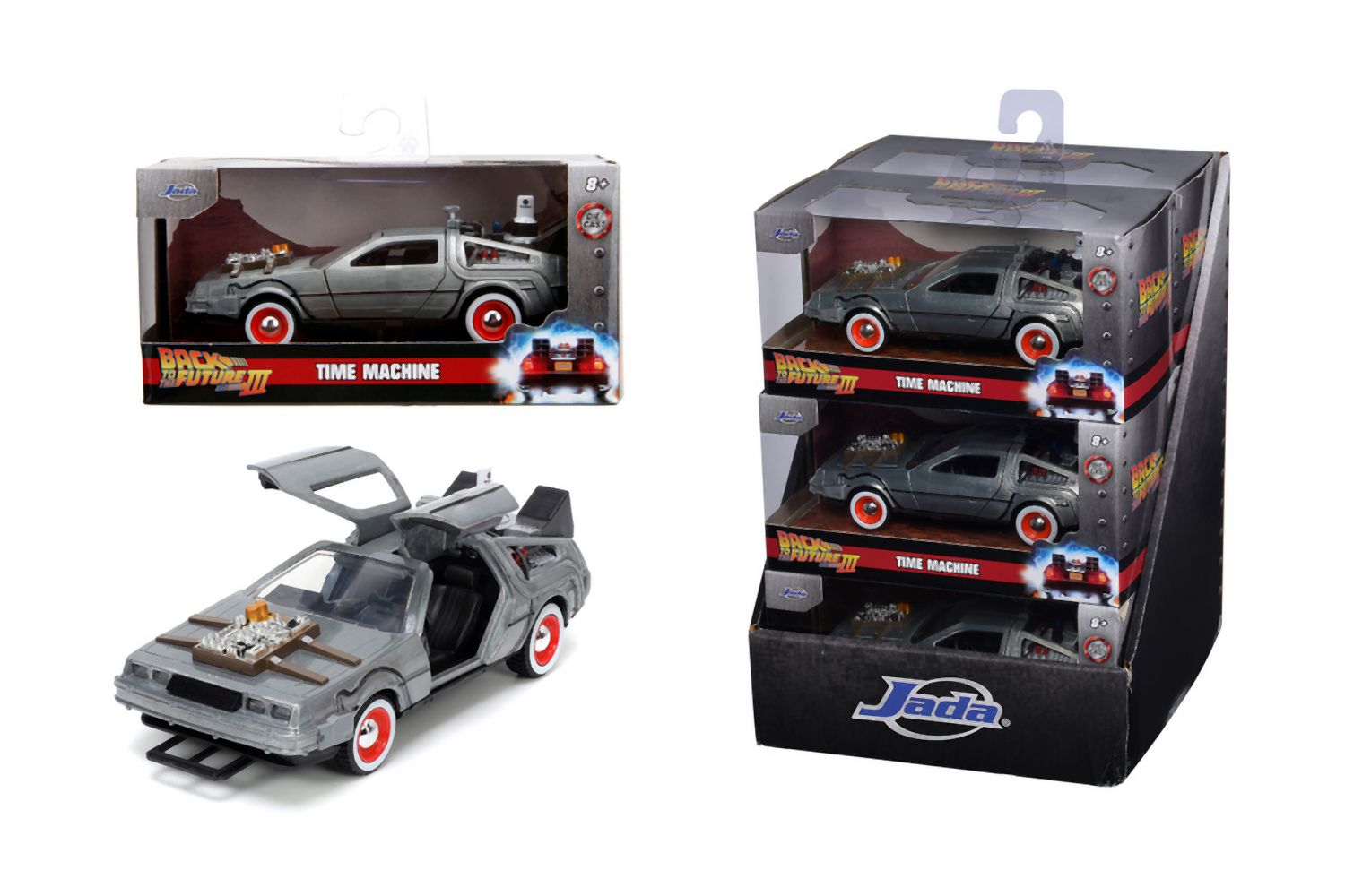 Kovový model Time Machine Back to the Future 3 na volnoběh v měřítku 1:32 s otevíracími dveřmi.