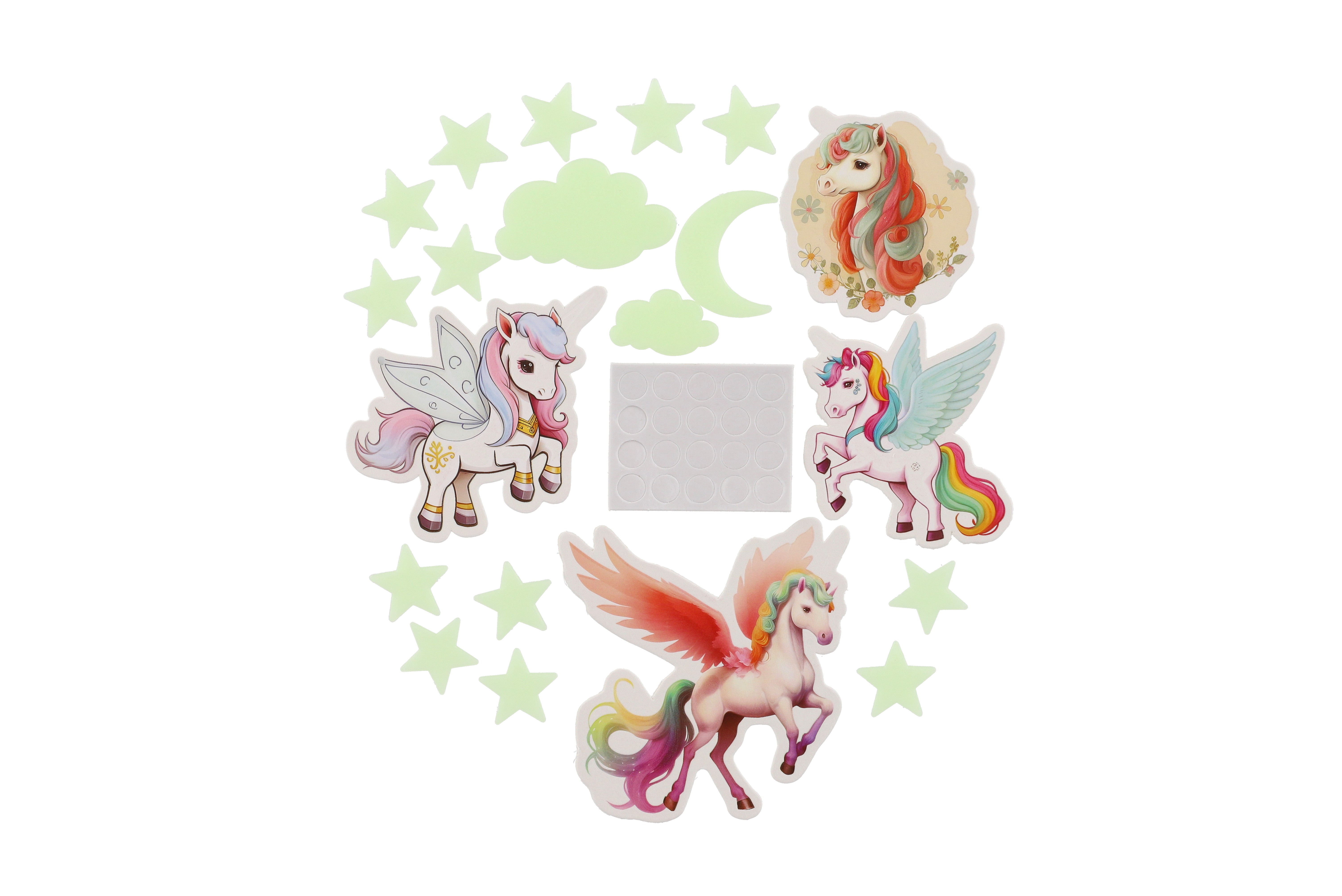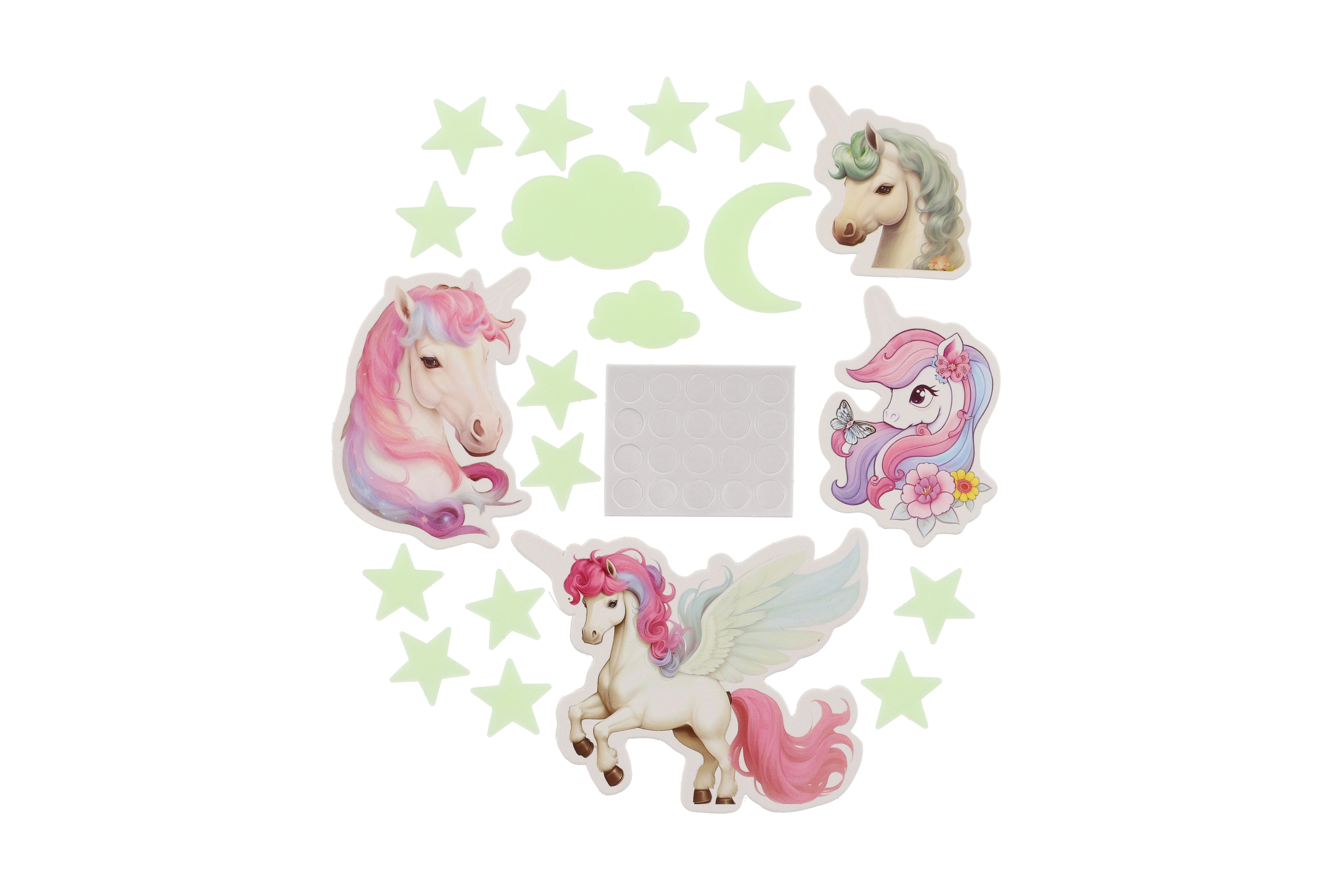 Sada obsahuje roztomilé jednorožce, kteří po nasvícení ve tmě rozjasní dětský pokoj a vytvoří tak okouzlující atmosféru plnou magie. Svítící jednorožci přinesou do dětského pokoje kouzelný nádech, který pomůže dětem usnout a vytvoří klidné a magické prostředí pro spaní. Rozměry balení 17 x 25 x 1 cm. Vhodné pro děti od 3 let.