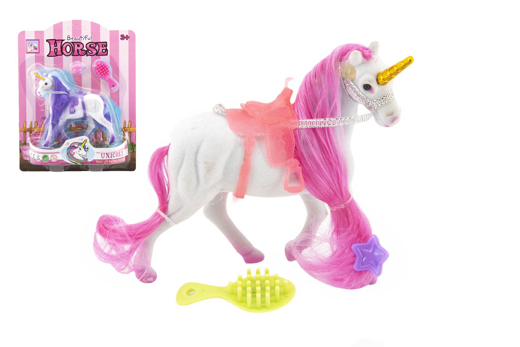 Jednorožec/kůň fliška 15cm česací se sedlem s doplňky 2 barvy na kartě