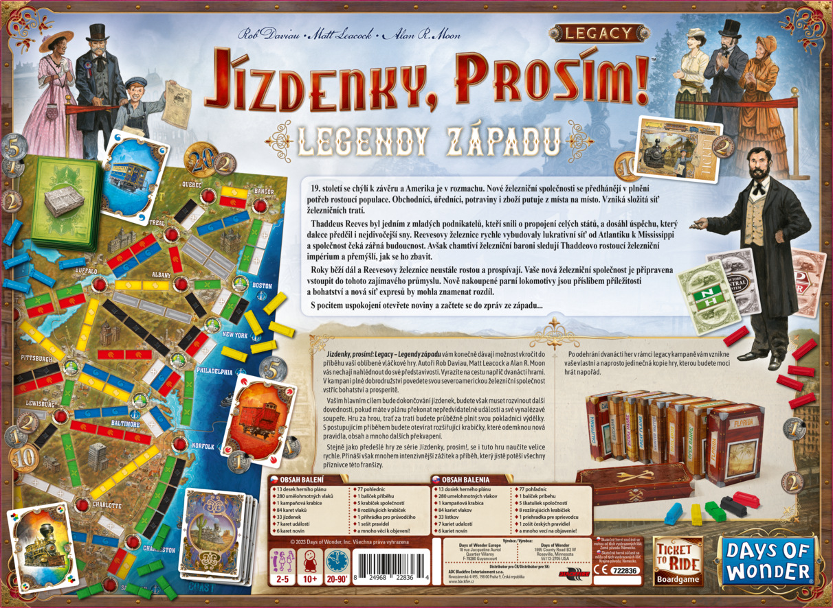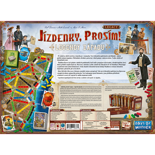 Jízdenky, prosím!: Legacy – Legendy západu vám konečně dávají možnost vkročit do příběhu vaší oblíbené vláčkové hry. Autoři Rob Daviau, Matt Leacock a Alan R. Moon vás nechají nahlédnout do své představivosti. Vyrazíte na cestu napříč dvanácti hrami.
