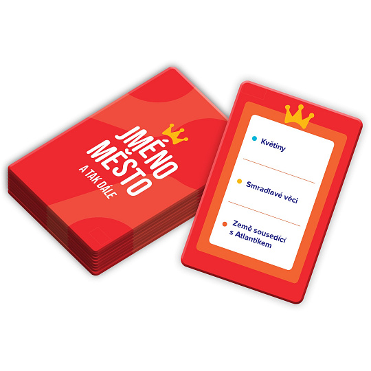 JMÉNO, MĚSTO A TAK DÁLE je unikátní mix karetní party hry a všem dobře známé slovní hry ze školních lavic. Zbavte se z ruky karet s písmeny vymýšlením slov v roztodivných kategoriích. Znáte sport na R? Značku piva na Z? Animovanou postavičku na E? Přísadu na pizzu na O? Snadné, že? Jen do té doby, než někdo zahraje akční karty, které dokážou celou hru pěkně zamotat!