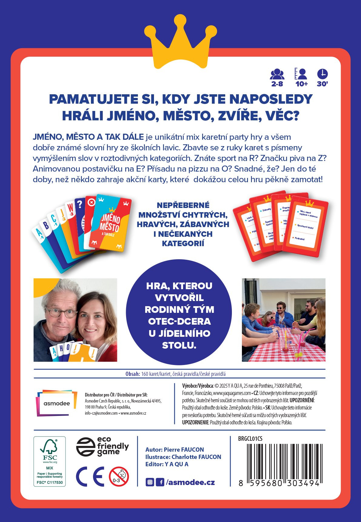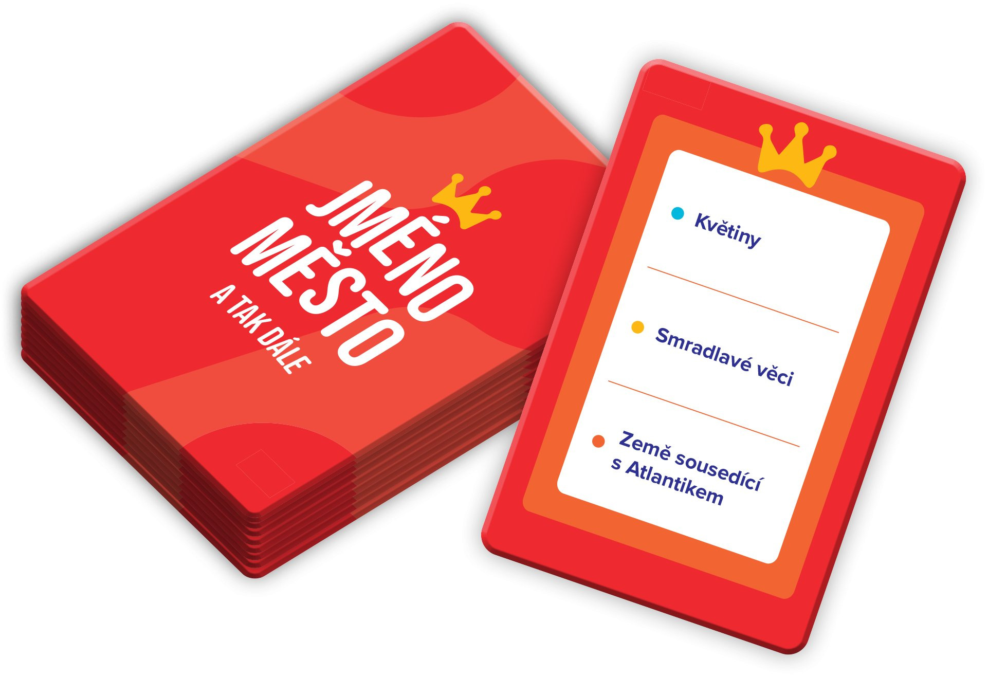 JMÉNO, MĚSTO A TAK DÁLE je unikátní mix karetní party hry a všem dobře známé slovní hry ze školních lavic. Zbavte se z ruky karet s písmeny vymýšlením slov v roztodivných kategoriích. Znáte sport na R? Značku piva na Z? Animovanou postavičku na E? Přísadu na pizzu na O? Snadné, že? Jen do té doby, než někdo zahraje akční karty, které dokážou celou hru pěkně zamotat!