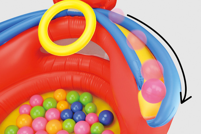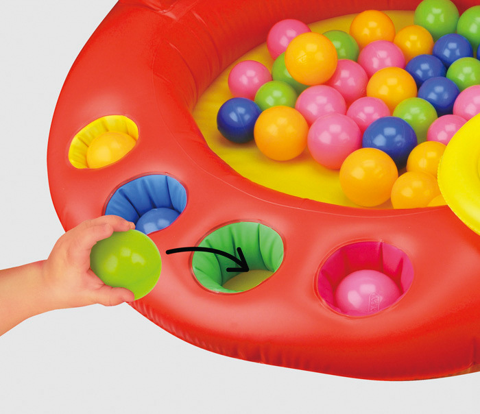 Děti milují míčky! S nafukovací arénou Patrik, která obsahuje 20 míčků, si děti užijí spoustu zábavy. Připevni žlutý kroužek pod nos pejska a zkus se do něj trefit míčky. Hoď nebo polož míček na žluto-modrou klouzačku a sleduj, jak se klouže dolů do arény. Poznávej barvy. Najdi správnou barvu míčku a vlož jej do barevného otvoru. Pro podporu koordinace oko-ruka je zde připraveno házení kroužků. Tato hračka není určena na vodu! Rozměry produktu: 93 x 60 x 93 cm. Rozměry balení: 37 x 49,8 x 12,3 cm. Věk: 12 m+... více
