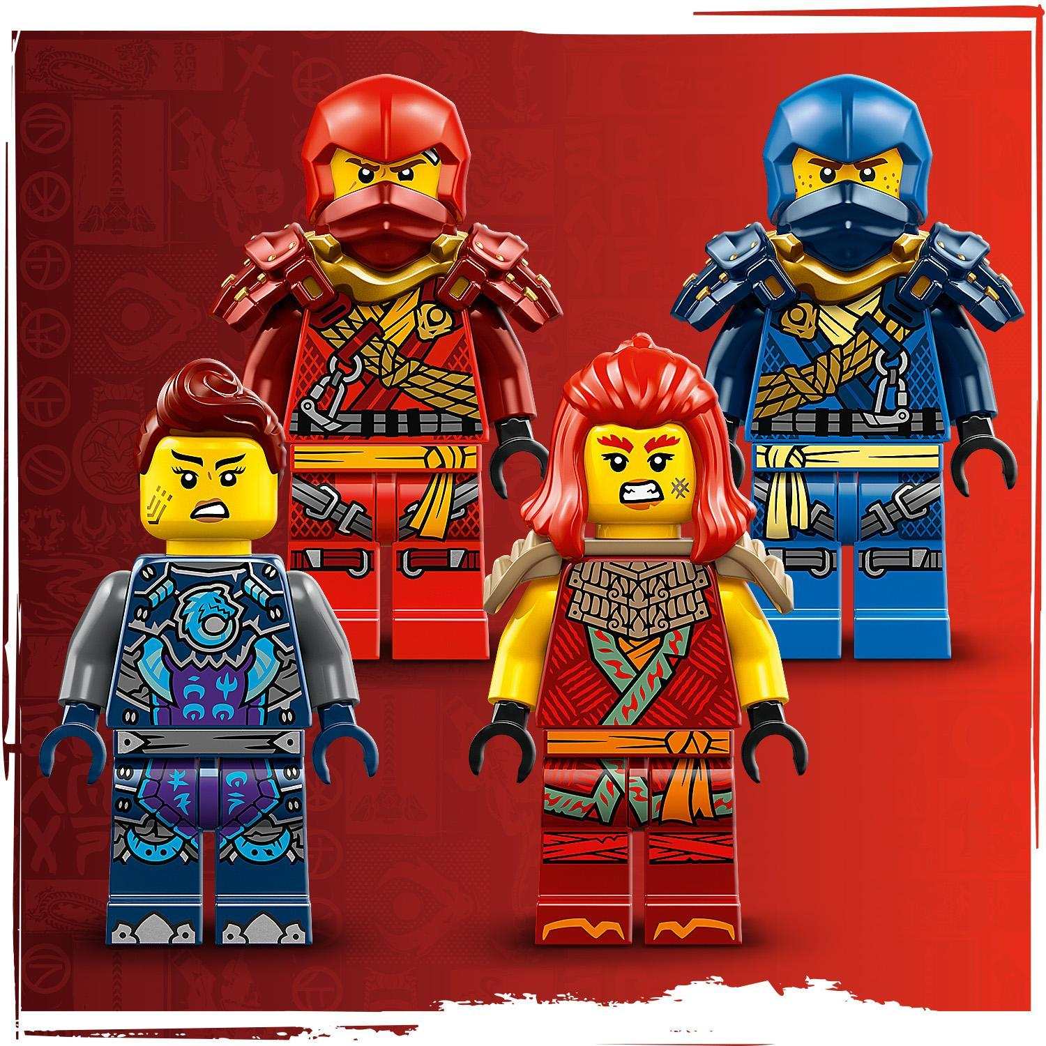 Součástí nindžovské hračky jsou 4 minifigurky NINJAGO: Lezec Kai a lezec Jay s katanami, Wyldfyre se 2 ohnivými pěstmi a zlá Jordana s kluzákem.