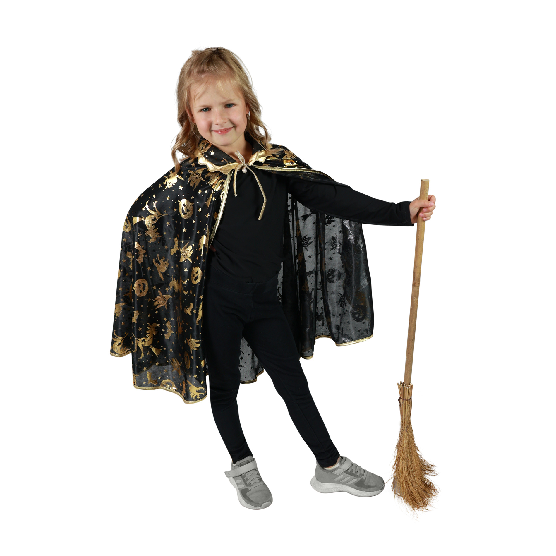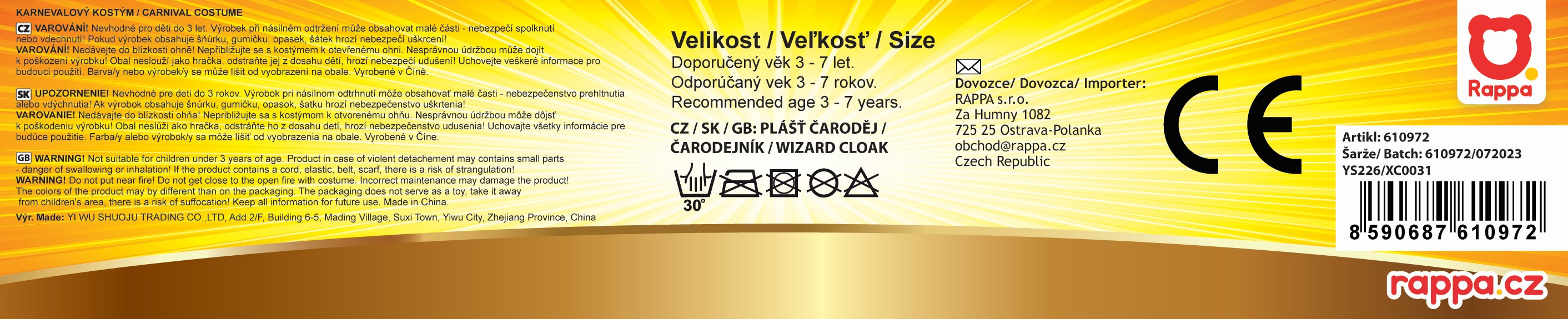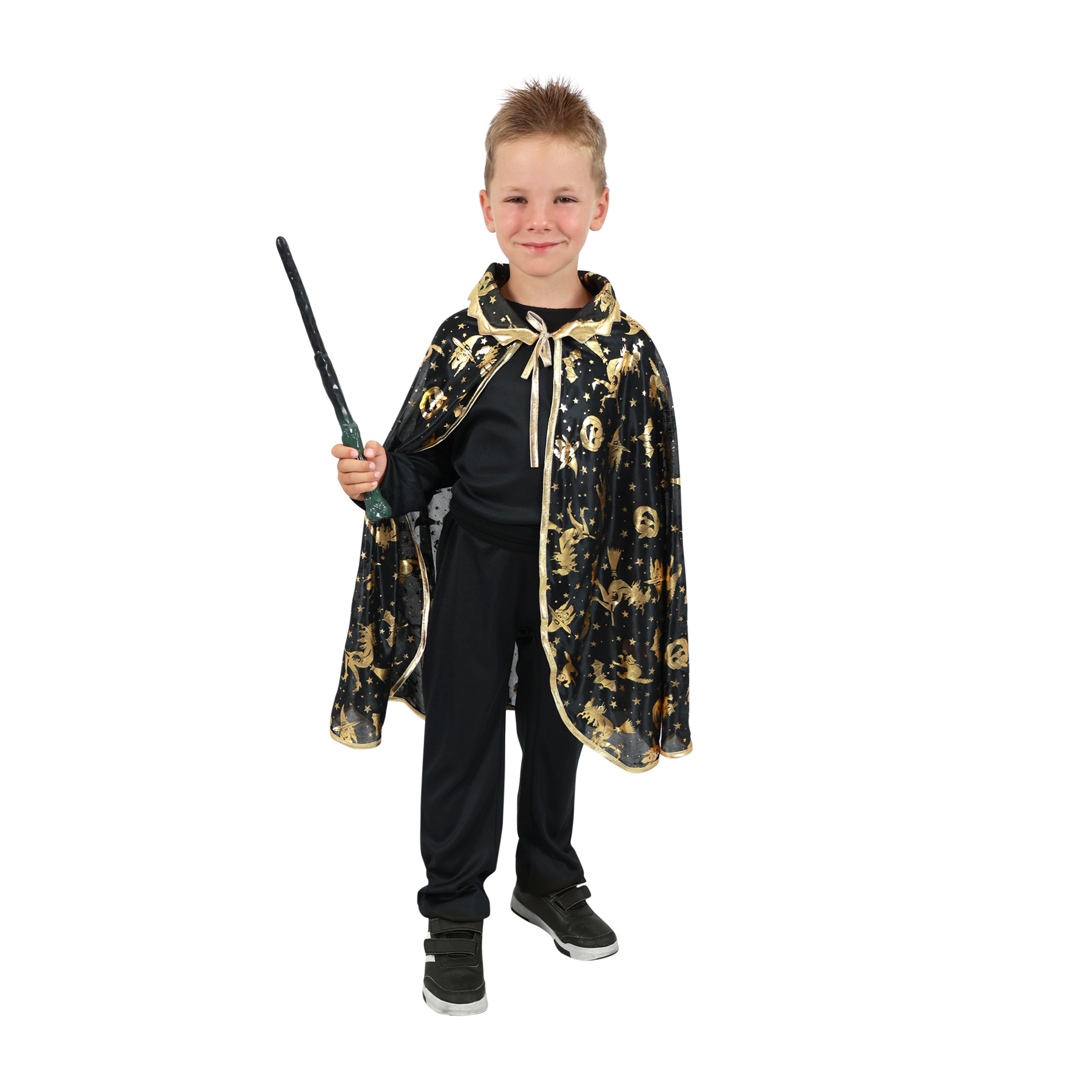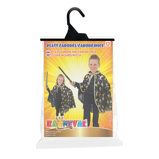Kouzelný čarodějnický plášť na karneval nebo Halloween! Černý plášť je dekorován halloweenskými motivy zlaté barvy. Doporučeno pro děti ve věkovém rozmezí 3-10 let. Délka 62 cm.