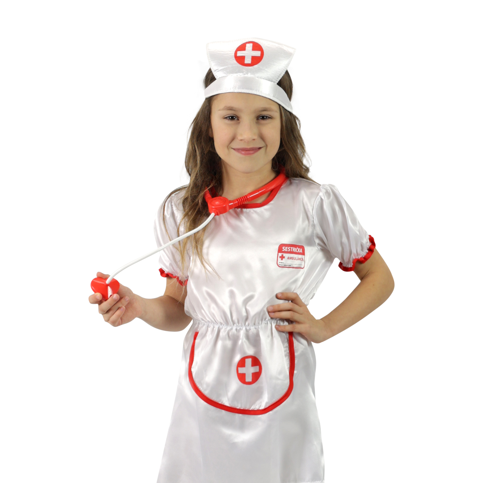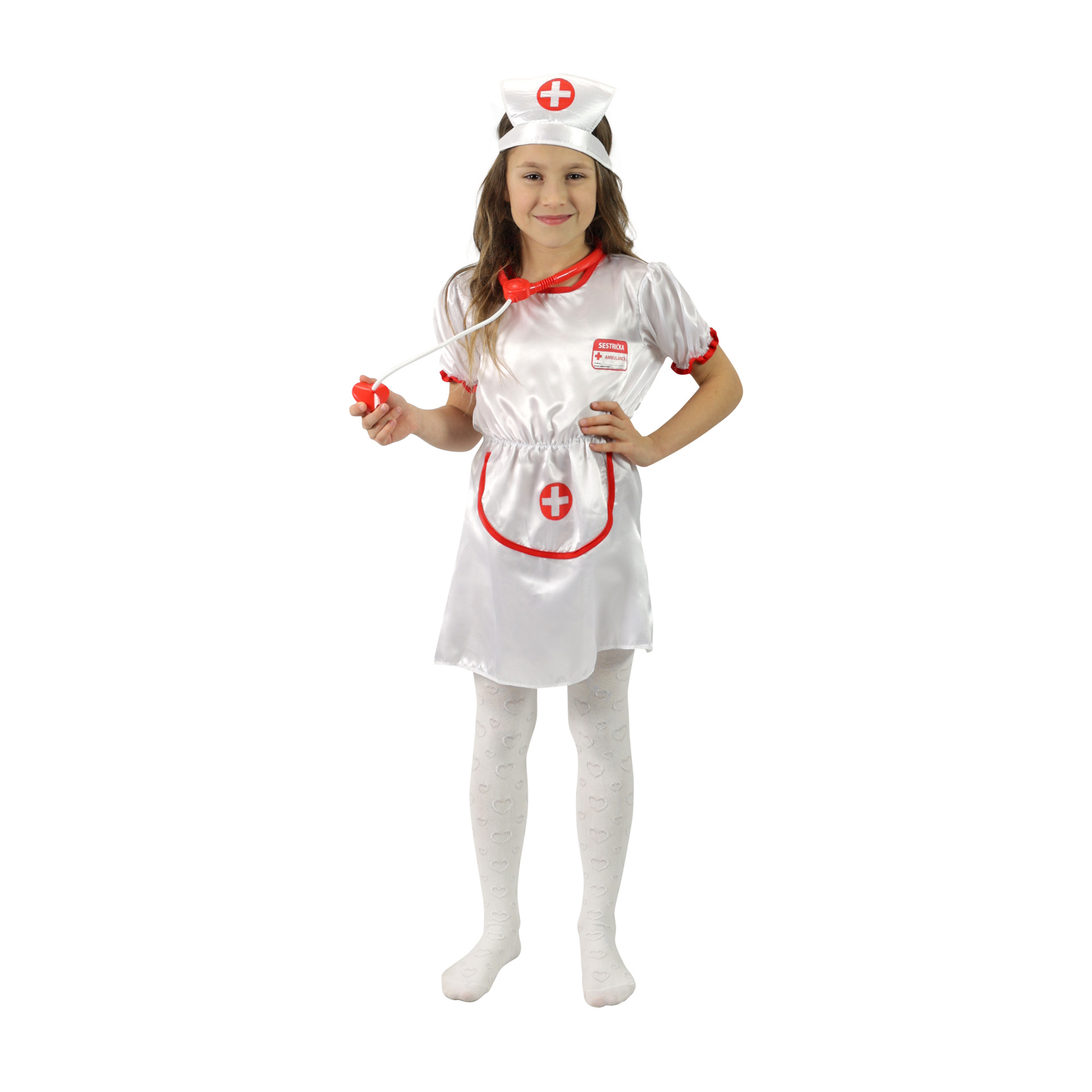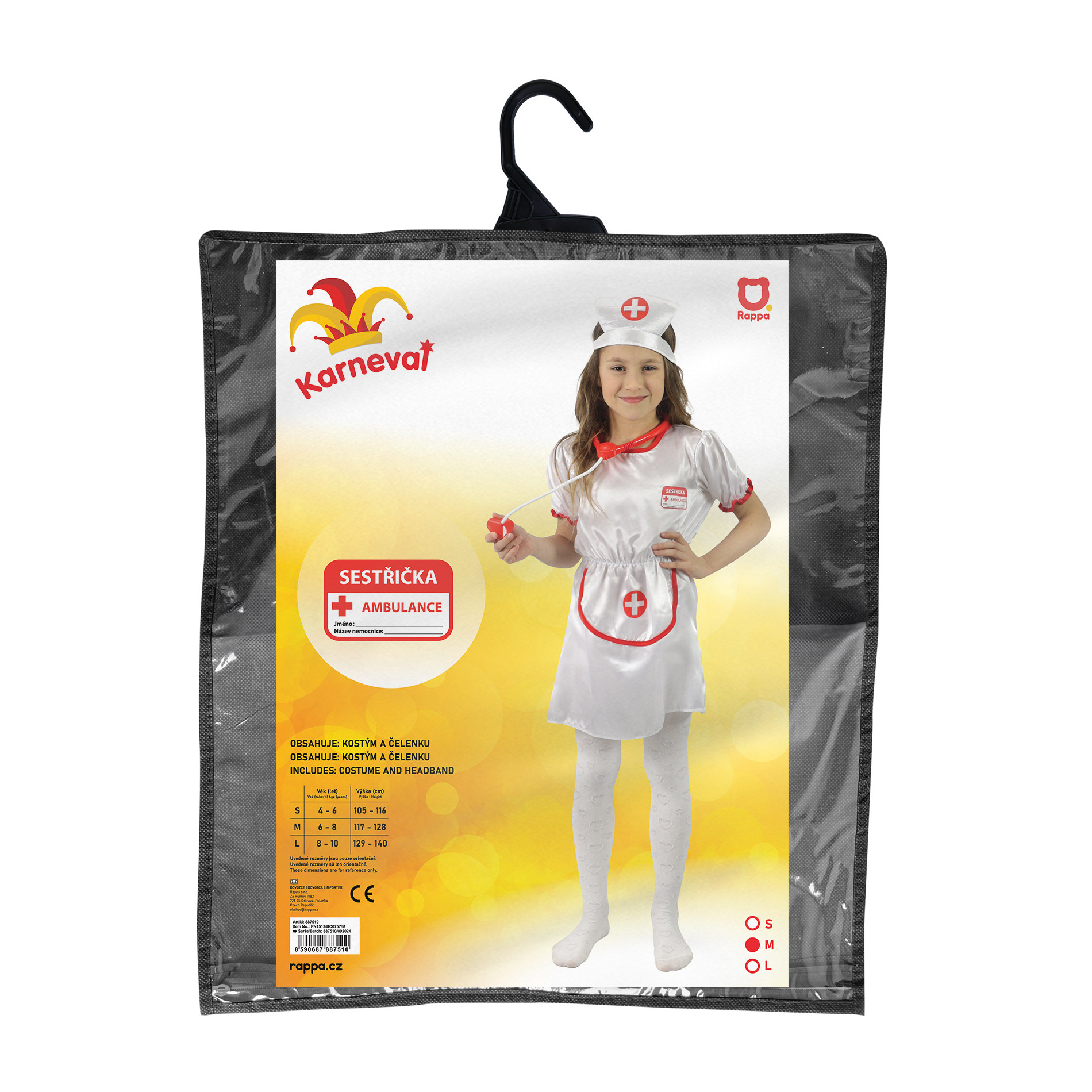 Krásný karnevalový kostým pro malé zdravotní sestřičky. Kostým velikosti M je určen pro děvčata ve věkovém rozmezí 6-8 let (117-128 cm). Sada obsahuje šaty a čepici. Stetoskop není součástí balení.
