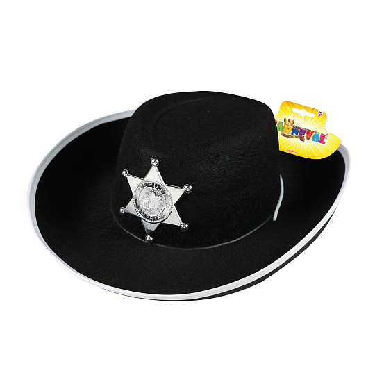 Senzační klobouk pro malé šerify! Tento černý elegán je zdoben opravdickým odznakem s nápisem SHERIFF a stříbrným lemováním. Staň se hvězdou karnevalového večírku díky tomuto nepřehlédnutelnému klobouku a ohrom tak všechny své kamarády!
