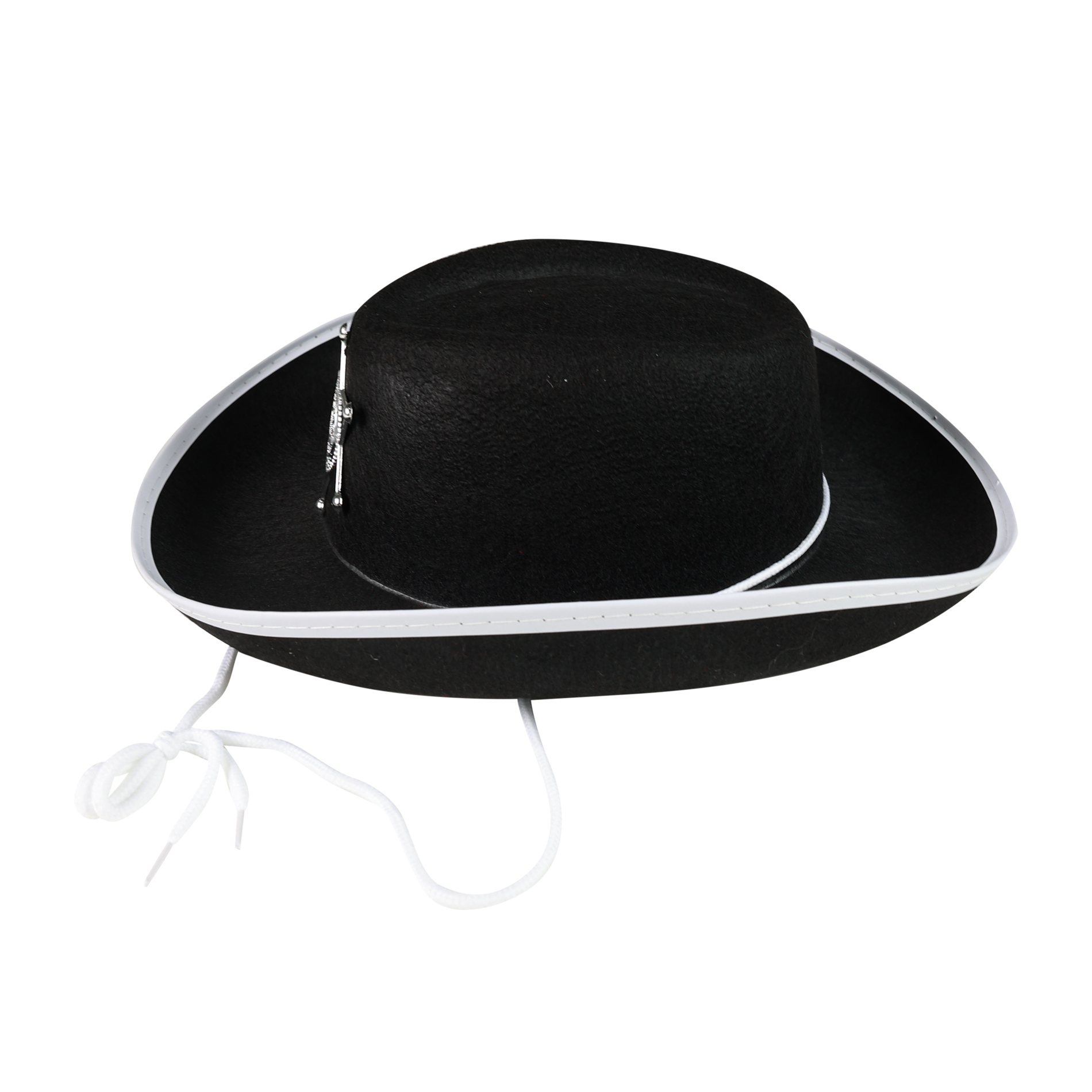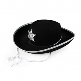 Senzační klobouk pro malé šerify! Tento černý elegán je zdoben opravdickým odznakem s nápisem SHERIFF a stříbrným lemováním. Staň se hvězdou karnevalového večírku díky tomuto nepřehlédnutelnému klobouku a ohrom tak všechny své kamarády!