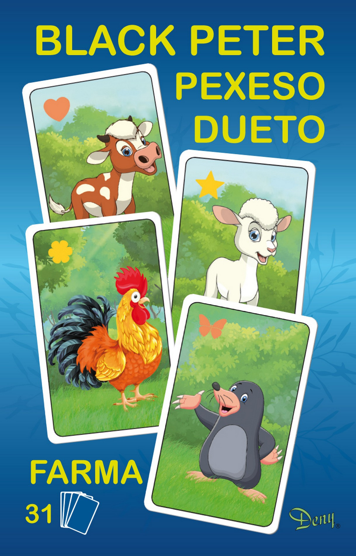 Černý Petr klasická karetní hra s obrázky. Hra se skládá z 31 karet, které jsou rozděleny do 15 dvojic, z nichž je každá dvojice označena stejným obrázkem. Pouze jediná karta se od ostatních liší a to je Černý Petr . Vyhrává ten, kdo bude mít dvojice vyloženy nejdříve. Prohrává ten, komu zůstane v ruce Černý Petr. Hry se můžou zúčastnit nejméně 3 hráči. Součástí balení je 31 karet a 1 návod. Tento karetní set si oblíbí všechny děti milující zvířátka z farmy.