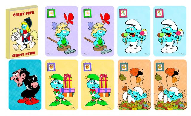 Dětské karty pro hru zvanou Černý Petr s obrázky Šmoulové. Krabička obsahuje i podrobný návod a karty mají na rubové straně mírně zdrsnělý povrch pro lepší manipulaci s nimi.