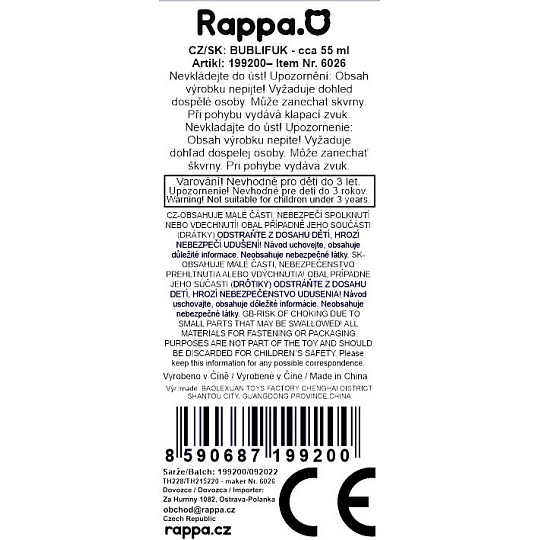 Senzační bublifuk se zvířátkem má obsah 55 ml. Foukátko je součástí víčka. Při pohybu vydává zvířátko klapací zvuk. S tímto kouskem vytvoříš zaručeně spoustu bublinek! Odběr u tohoto zboží je pouze po celém balení 24 ks.