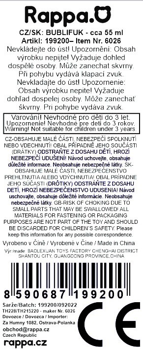 Senzační bublifuk se zvířátkem má obsah 55 ml. Foukátko je součástí víčka. Při pohybu vydává zvířátko klapací zvuk. S tímto kouskem vytvoříš zaručeně spoustu bublinek! Odběr u tohoto zboží je pouze po celém balení 24 ks.
