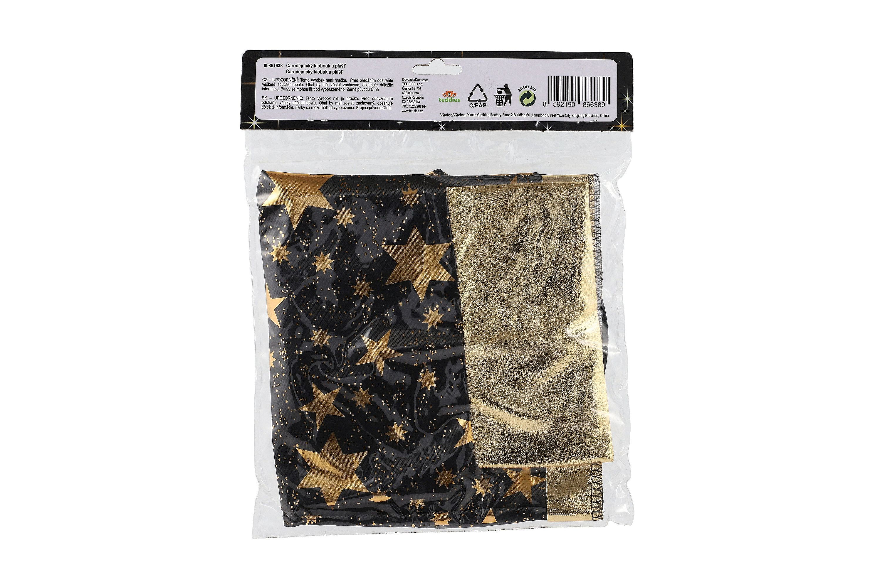 Klobouk čarodějnický + plášť pro děti průměr 38cm černo-zlatý v sáčku karneval