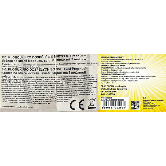 Rozjeď tu pravou disko párty s tímto senzačním kloboukem! Stylový klobouček stříbrné barvy je zdoben flitry, a navíc po zapnutí barevně bliká - 3 rychlosti blikání (při každém dalším zmáčknutí se rychlost blikání změní). K aktivaci světýlek použijete nenápadné tlačítko, které je umístěno na boku klobouku. 3 baterie typu LR44 jsou jeho součástí.