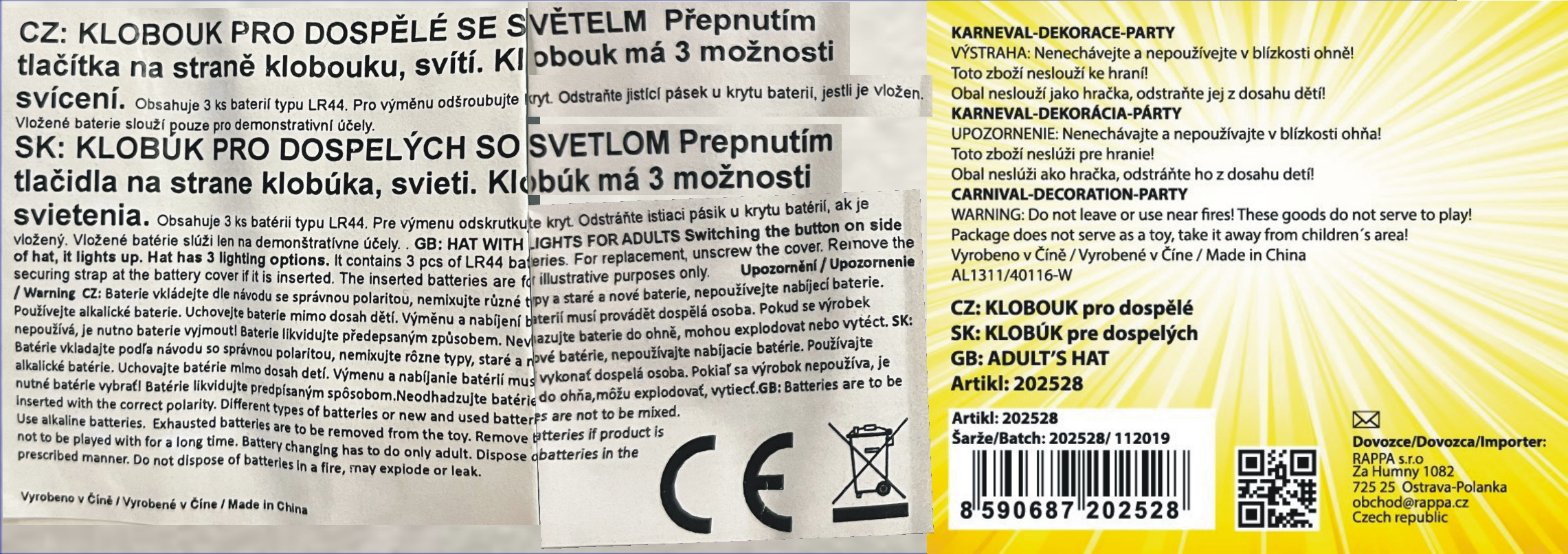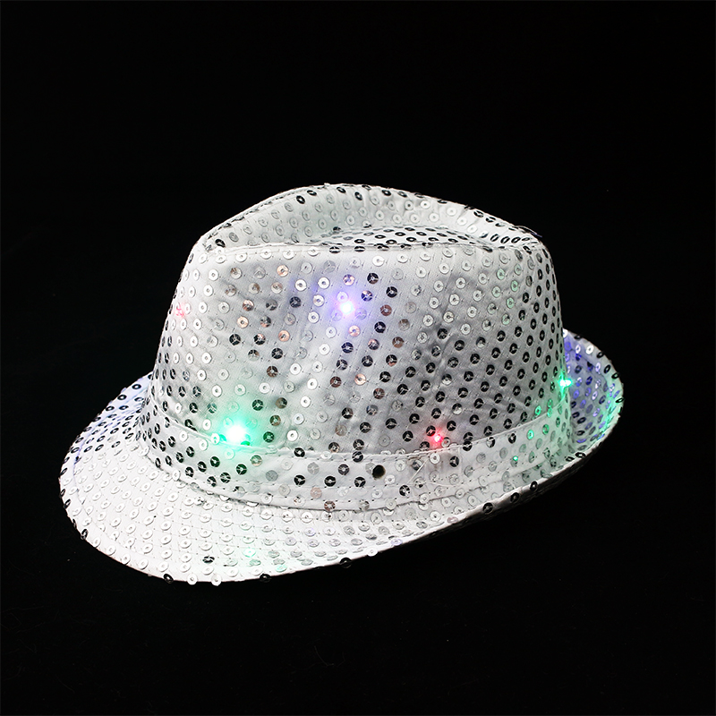 Rozjeď tu pravou disko párty s tímto senzačním kloboukem! Stylový klobouček stříbrné barvy je zdoben flitry, a navíc po zapnutí barevně bliká - 3 rychlosti blikání (při každém dalším zmáčknutí se rychlost blikání změní). K aktivaci světýlek použijete nenápadné tlačítko, které je umístěno na boku klobouku. 3 baterie typu LR44 jsou jeho součástí.