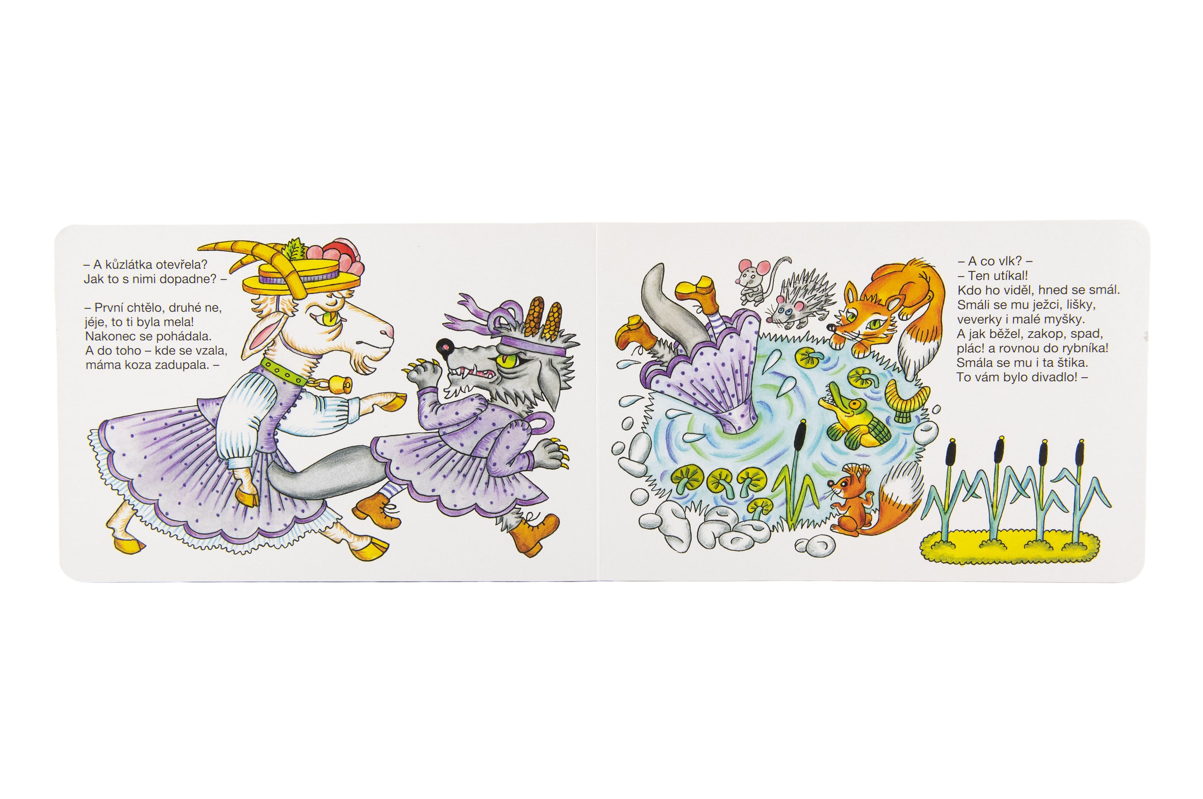 Leporelo s oblíbenou pohádkou pro nejmenší! To jsem já, bradička bílá! Otevřte, kůzlátka milá. Nesu sladké zelíčko, tak otevřte maličko! – Těmito líbeznými slůvky vlk přemlouvá kozlátka, aby mu otevřela, vyparáděný tak, že se musí děti smát, jak mu klobouk s pentlemi padne. Jedna z nejoblíbenějších dětských pohádek s ilustracemi Heleny Zmatlíkové, kterou děti znají nazpaměť od nejútlejšího dětství. Verši doprovází Věra Provazníková. Vhodné pro děti od 2 let.