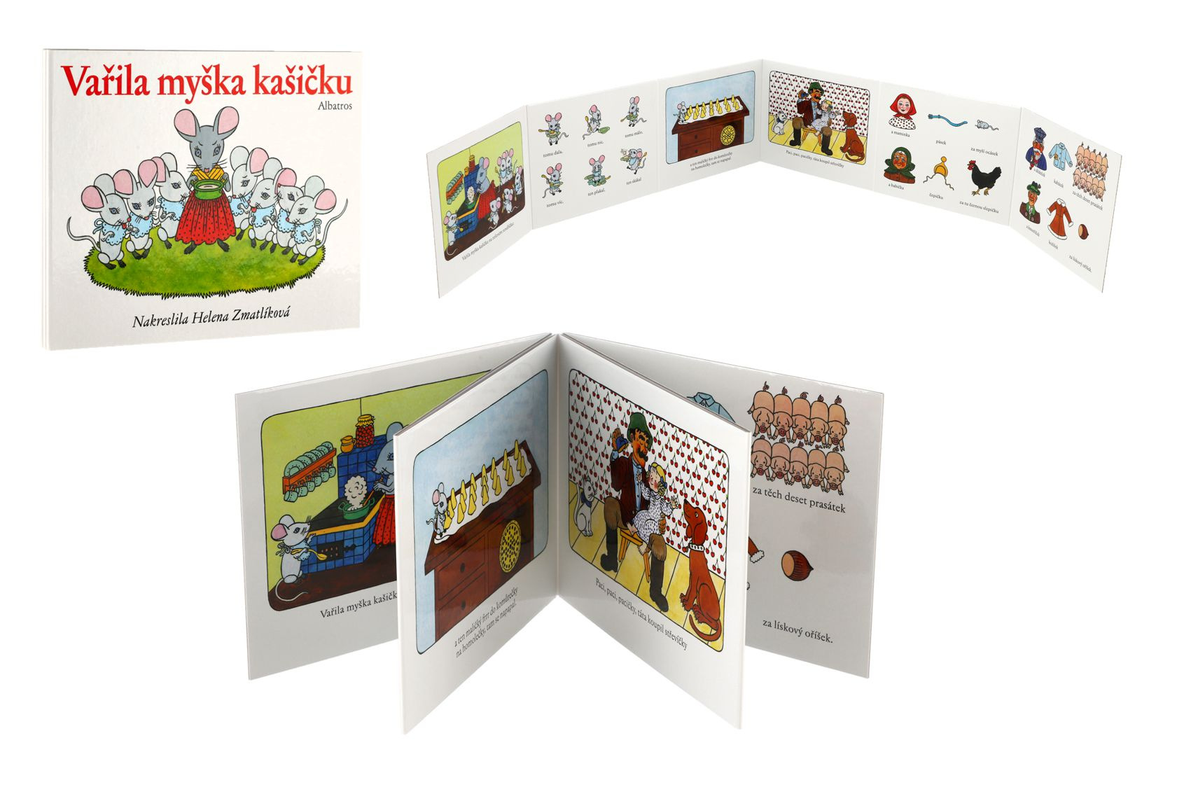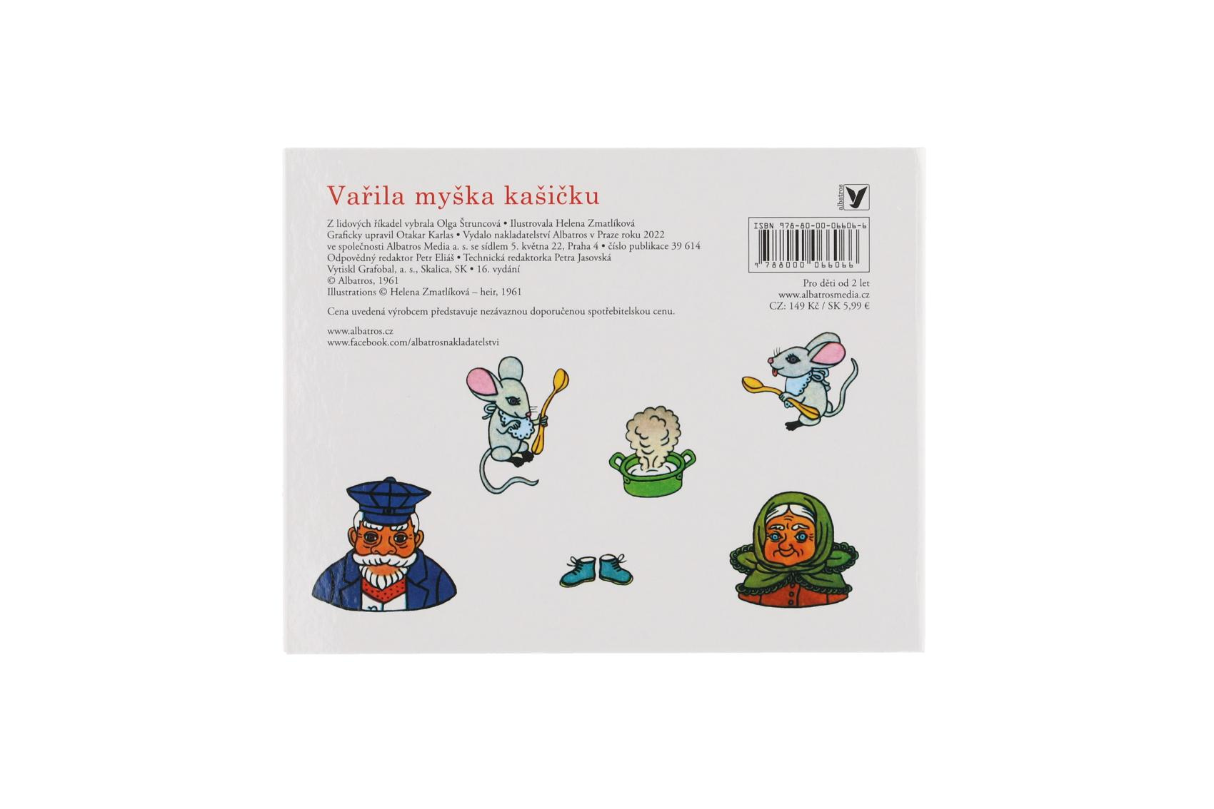 Leporelo s textem tří lidových říkadel – Vařila myška kašičku, Paci, paci, pacičky a Povídám, povídám pohádku – doprovázených půvabnými obrázky Heleny Zmatlíkové patří k evergreenům, které potěší vždy znovu a znovu. Rozměr složeného leporela: 16 x 12,5 cm Vhodné pro děti od 24 měsíců
