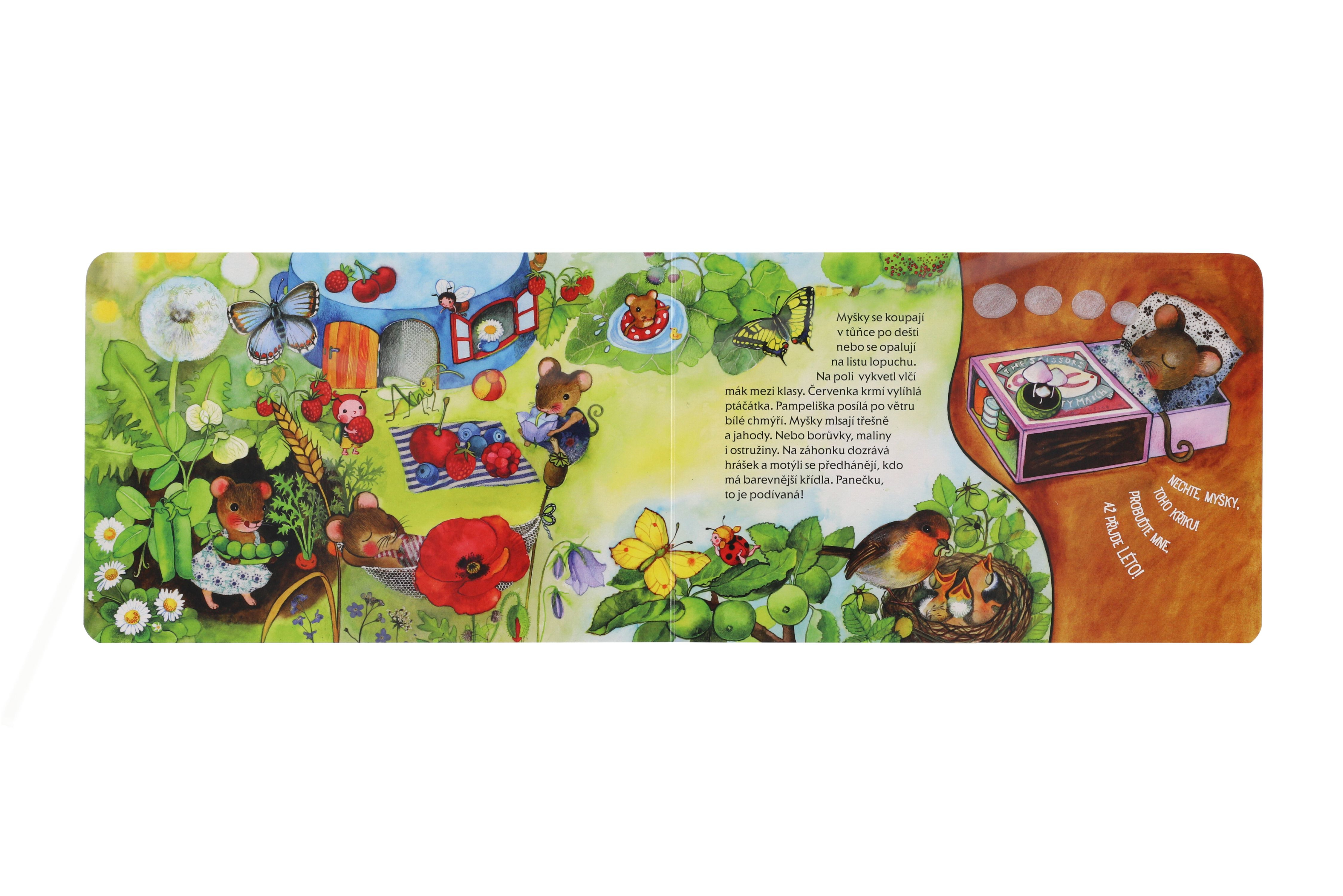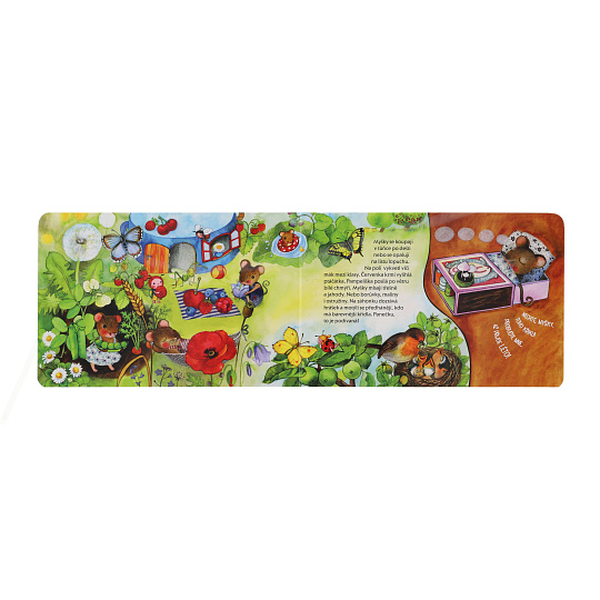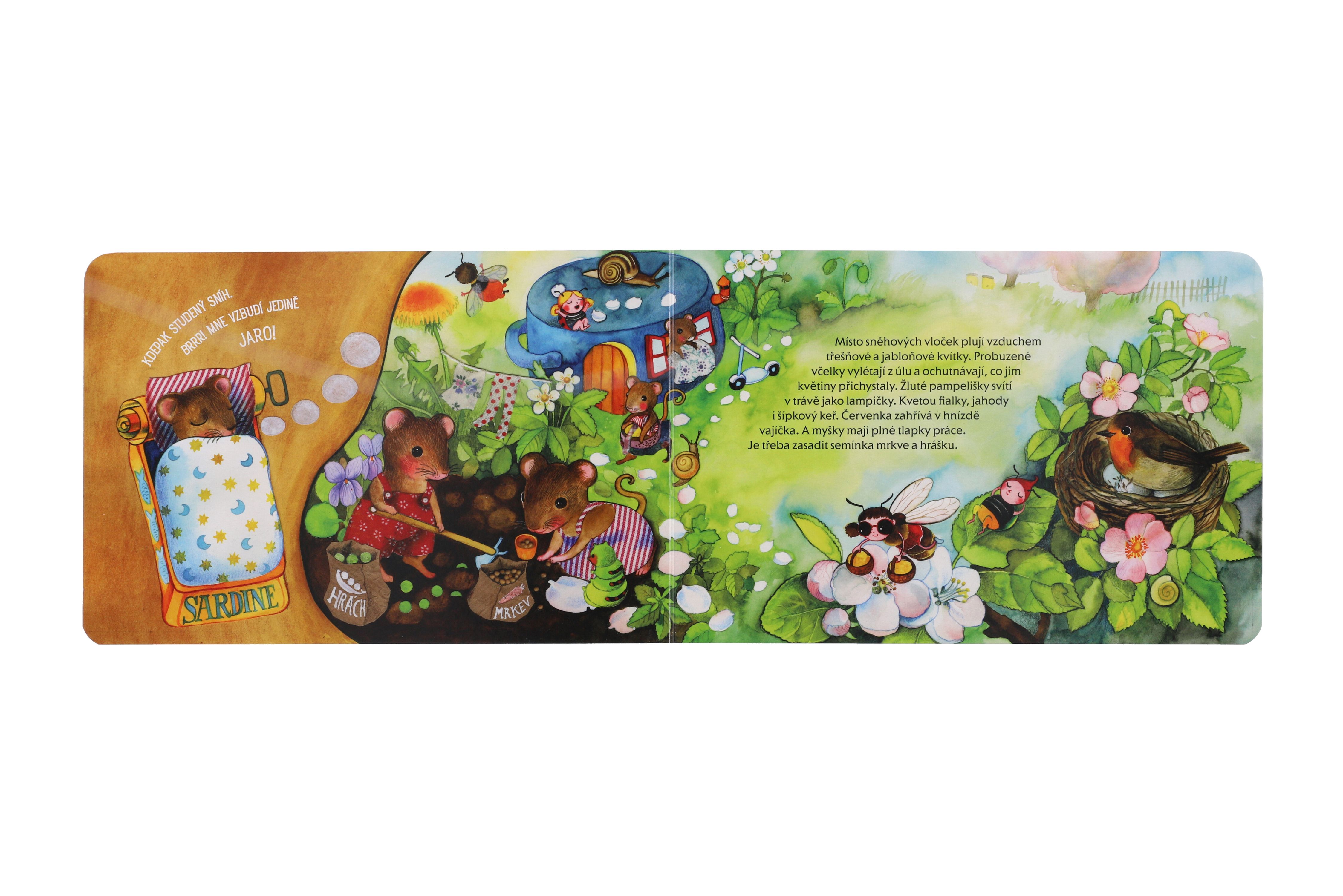 Co prožívají čtyři myšky během jednoho roku? V zimě většinou spí, jedna má postýlku z plechovky od sardinek, druhá z krabičky od sirek, třetí ze slaměných stébel, čtvrtá z bačkorky. Na jaře myšky vyskočí, pracují na zahrádce, v létě se koupají, mlsají ovoce, na podzim sklízejí záhonky a připravují se na zimu. Ale to jistě není všechno. V bohatě ilustrovaném leporelu toho objevíte mnohem víc! Velikost knihy: 24 x 16 cm Vhodné pro děti od 3 let