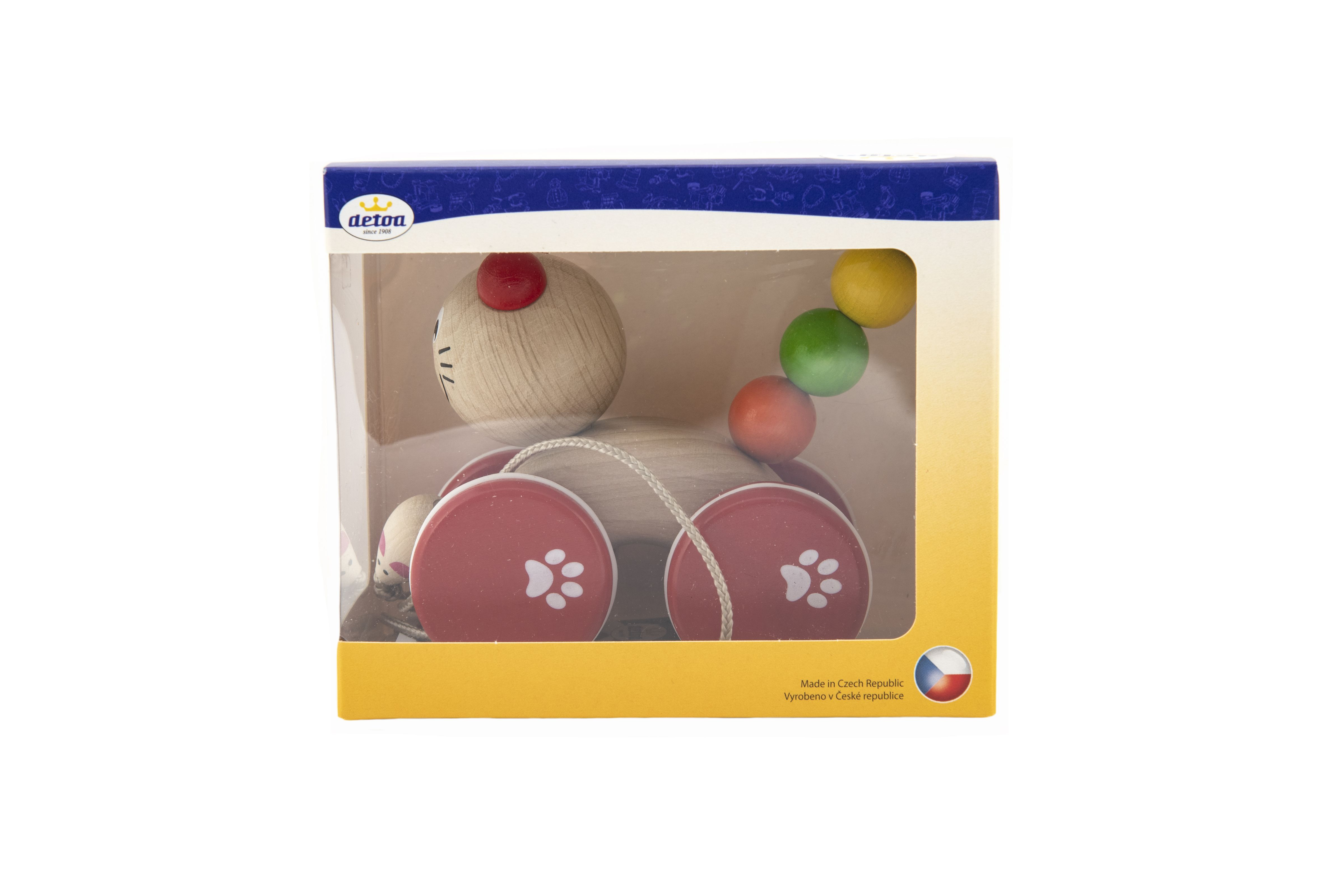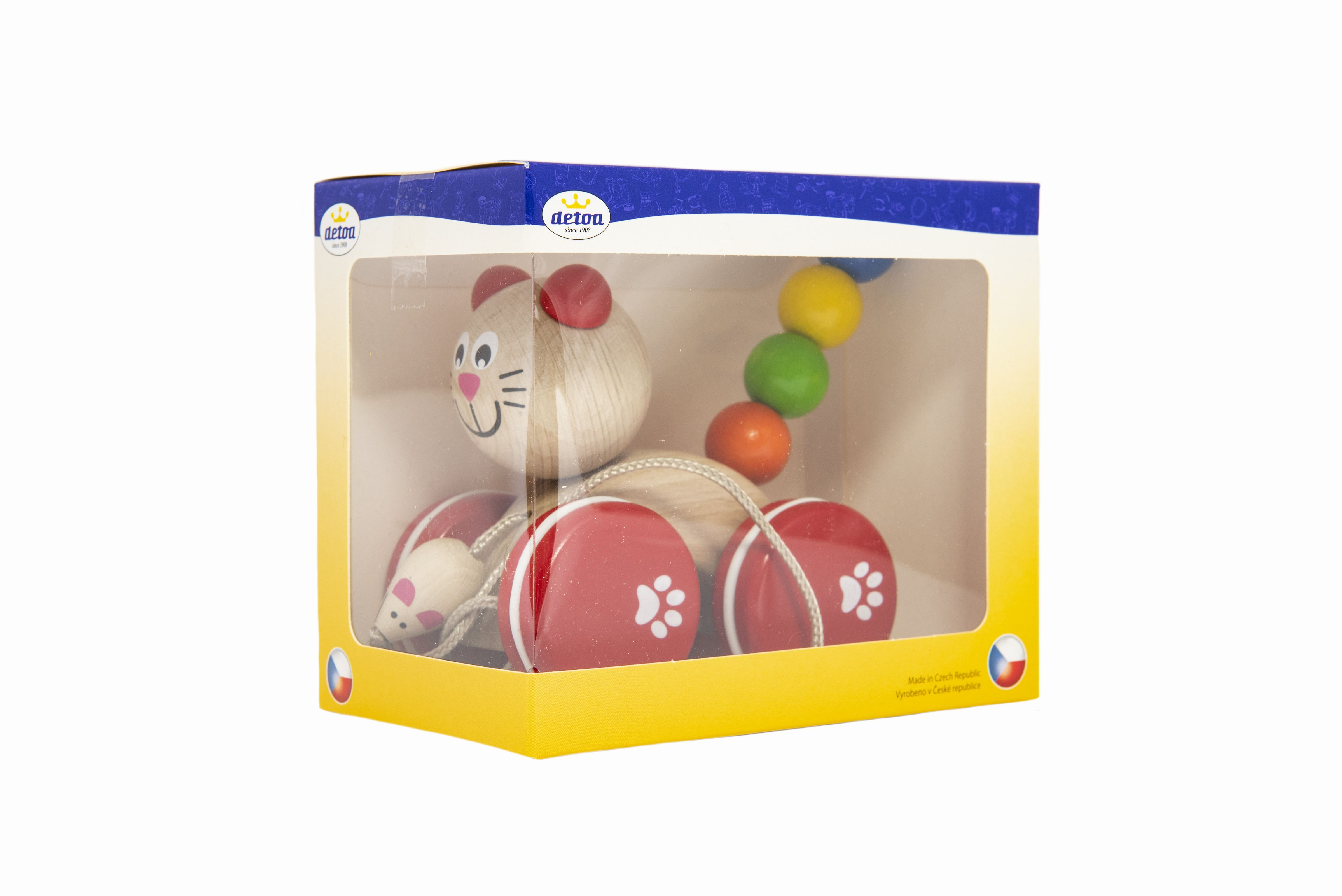 Začalo vaše děťátko již s prvními krůčky? Každé dítko má z chůze obrovskou radost a pro ještě větší zábavu mu pořiďte dřevěnou tahací hračku, kterou jsme měli snad všichni, když jsme byli malí. Tato tahací kočka má navíc na provázku přivázanou myšku. Rozměry balení 13 x 11 x 8 cm. Vhodné pro děti od 1 roku.