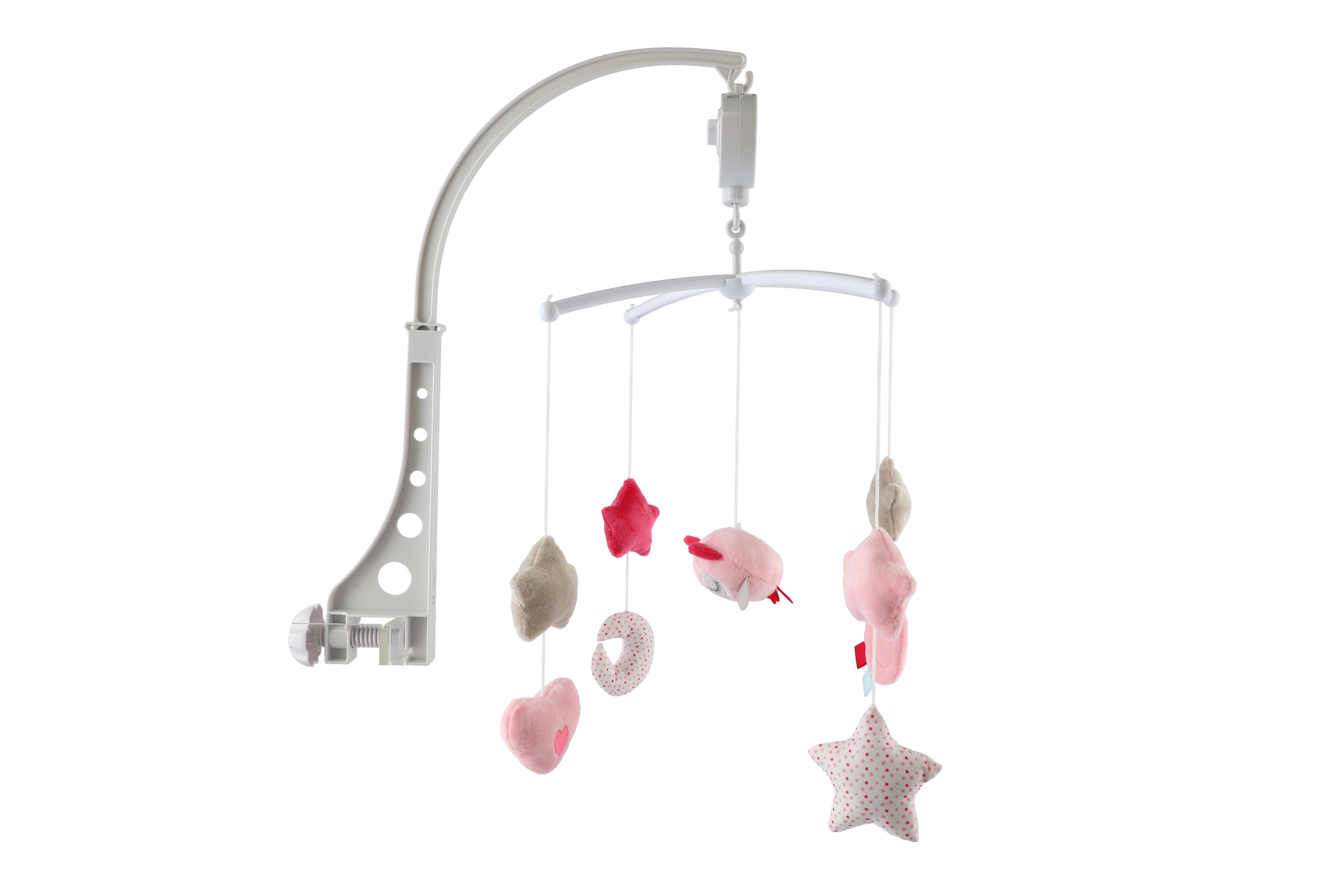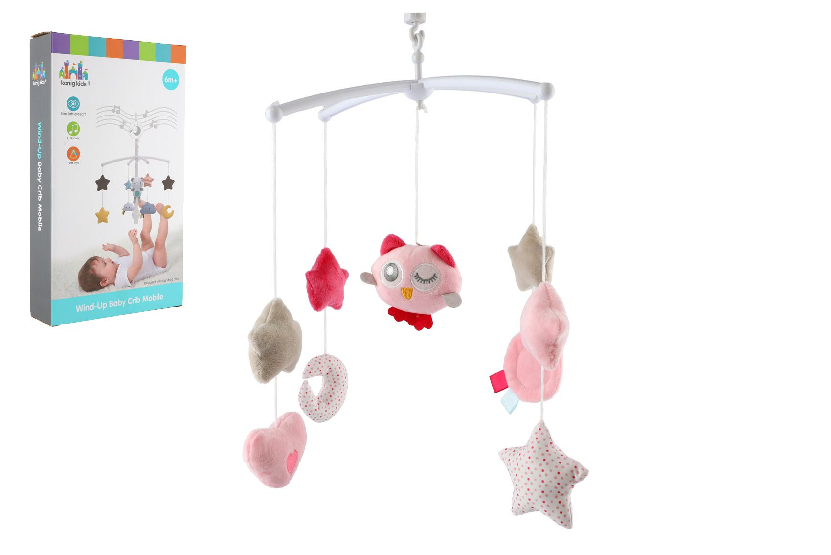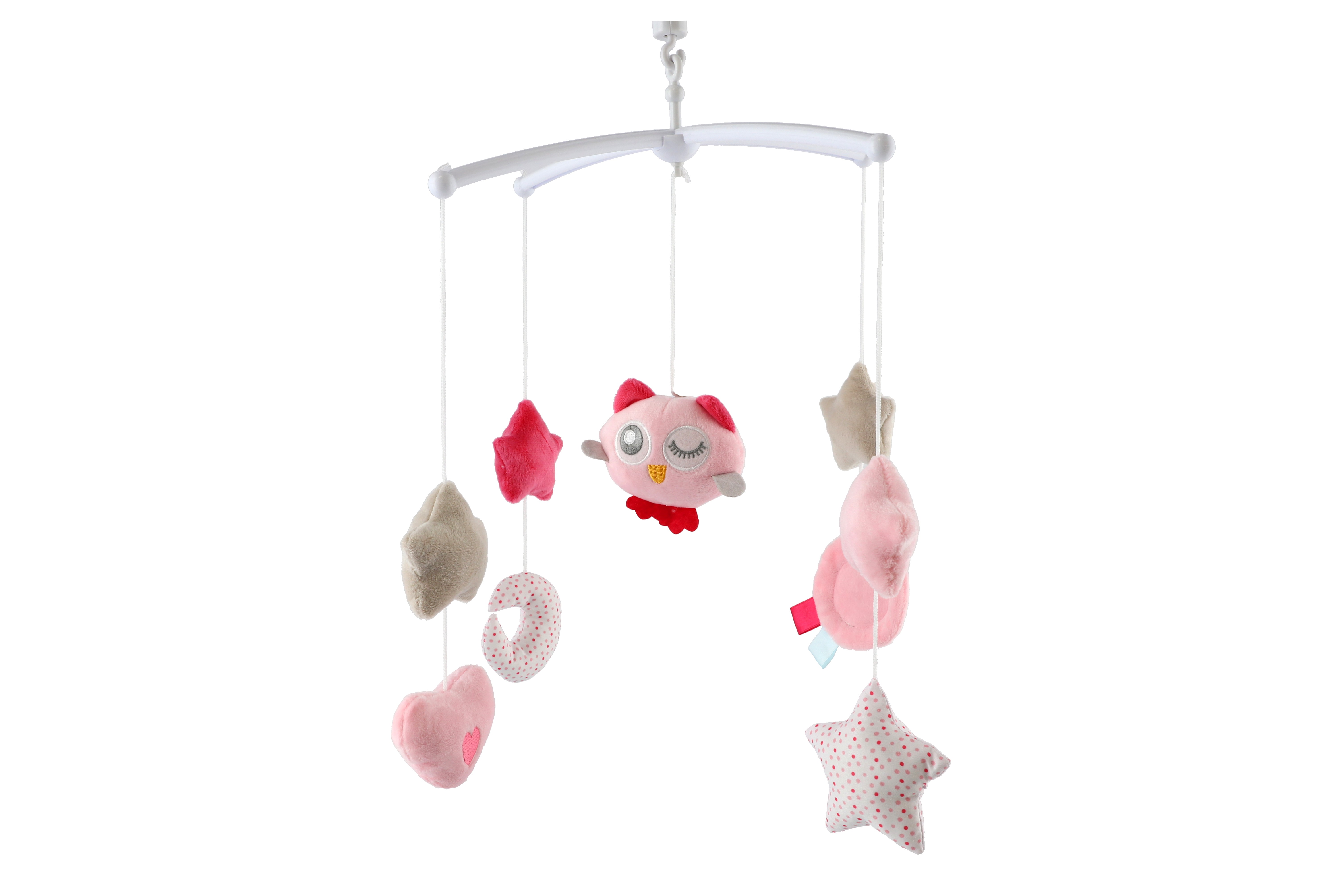 Kolotoč nad postýlku s plyšovými barevnými hračkami miminko zabaví a pomůže mu usnout. Na každém ze čtyř plastových ramenech najdete hvězdičku, srdíčko nebo měsíček a uprostřed sovičku. Kolotoč hraje příjemnou melodii - má natahovací stojek. Rozměr krabice: 19 x 33 x 5,5 cm Vhodné od 6 měsíců