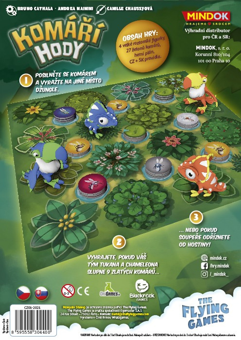 V temné džungli, v té zrádné džungli, tam pták komáry jíííí… Ve hře Komáří hody se každý ze dvou hráčů chopí jednoho loveckého týmu, sestávajícího z tukana a chameleona, a vydají se nachytat si z jezírek lahodné komáry. Ti největší fajnšmekři si pochutnají na vyhlášené delikatese: zlatých komárech.