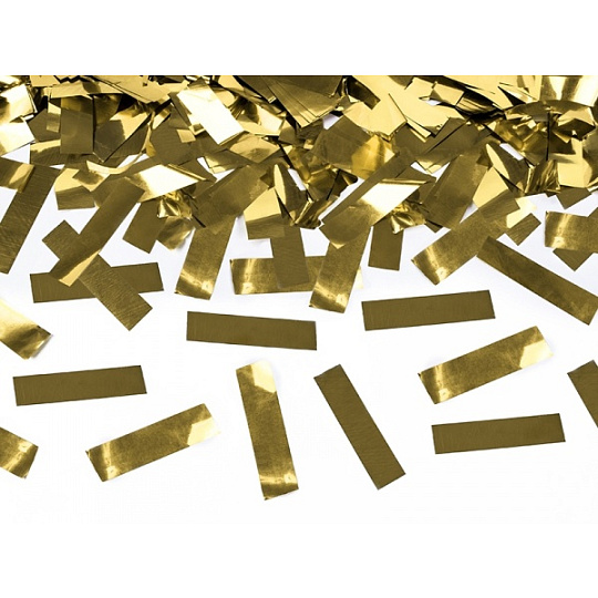 Zlaté metalické proužky konfety 40 cm. Konfety jsou uloženy ve válcovité tubě. Drží se v ruce a ovládají se mechanickým pootočením tubusu. Po vystřelení vyletí zlaté metalické proužky do výšky 5 až 8 metrů a rozptýlí se do okolí. Bezpečnost konfety lze použít ve venkovních i vnitřních prostorách. Bezpečná vzdálenost přihlížejících diváků od tuby konfet je 10 metrů. Iniciace stlačený vzduch. Tubus kov. Manipulace pootočení. Max délka odpálení 8 m.