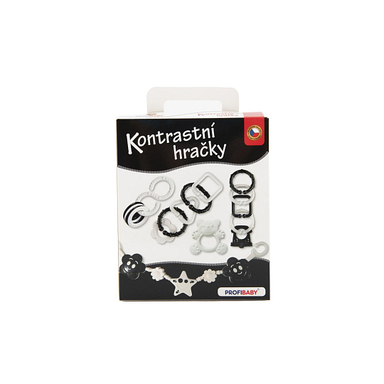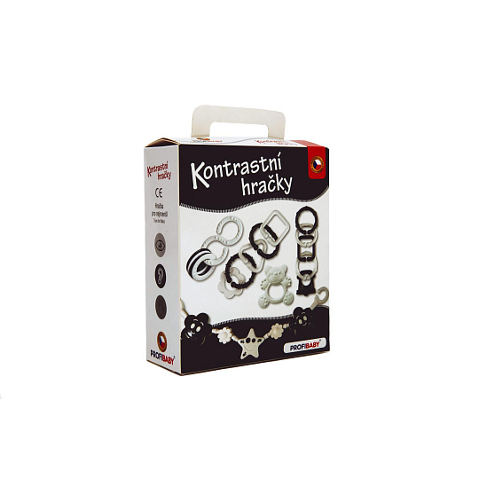 Set kontrastních hraček v dárkové krabičce v černobílém provedení. Tato barevná kombinace dokonale stimuluje smysl zraku u dítěte, které dosud nerozlišuje barvy. Chrastítka jsou tvarově koncipována tak, aby byla snadno uchopitelná dětskou rukou – při hře si dítě zároveň cvičí uchopovací reflex. Samozřejmostí ve výrobě je použití zdravotně nezávadných materiálů, splňujících náročné hygienické normy. Chrastítka jsou stálobarevná, bez ostrých hran, které by mohly dítěti při hře ublížit, a bez uvolnitelných malých částí, u nichž hrozí odlomení a následné případné vdechnutí či spolknutí dítětem.Balení obsahuje 4 výrobky v černobílé kombinaci. Vhodné pro děti od narození