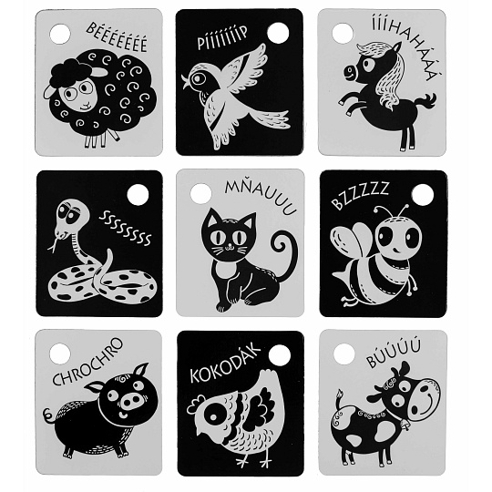 Kartičky jsou baleny po 9 kusech, vyrobeny z českých materiálů. V každé kartičce je otvor pro zavěšení. Součástí balení je plastový kroužek. Tyto kartičky zvyšují schopnost a podněcují dětskou přirozenou zvídavost, rozvíjejí dětskou motoriku, poznávání zvířátek.