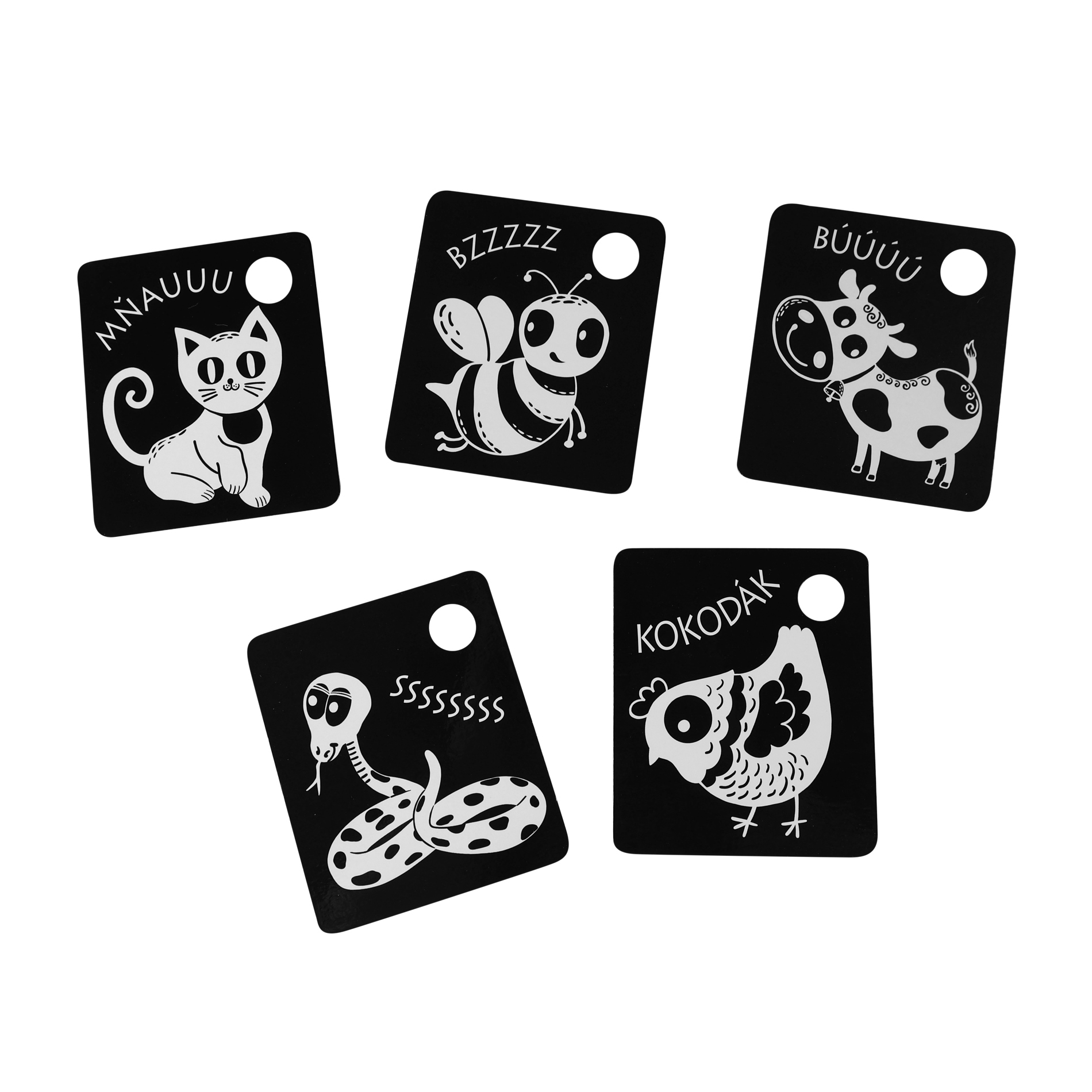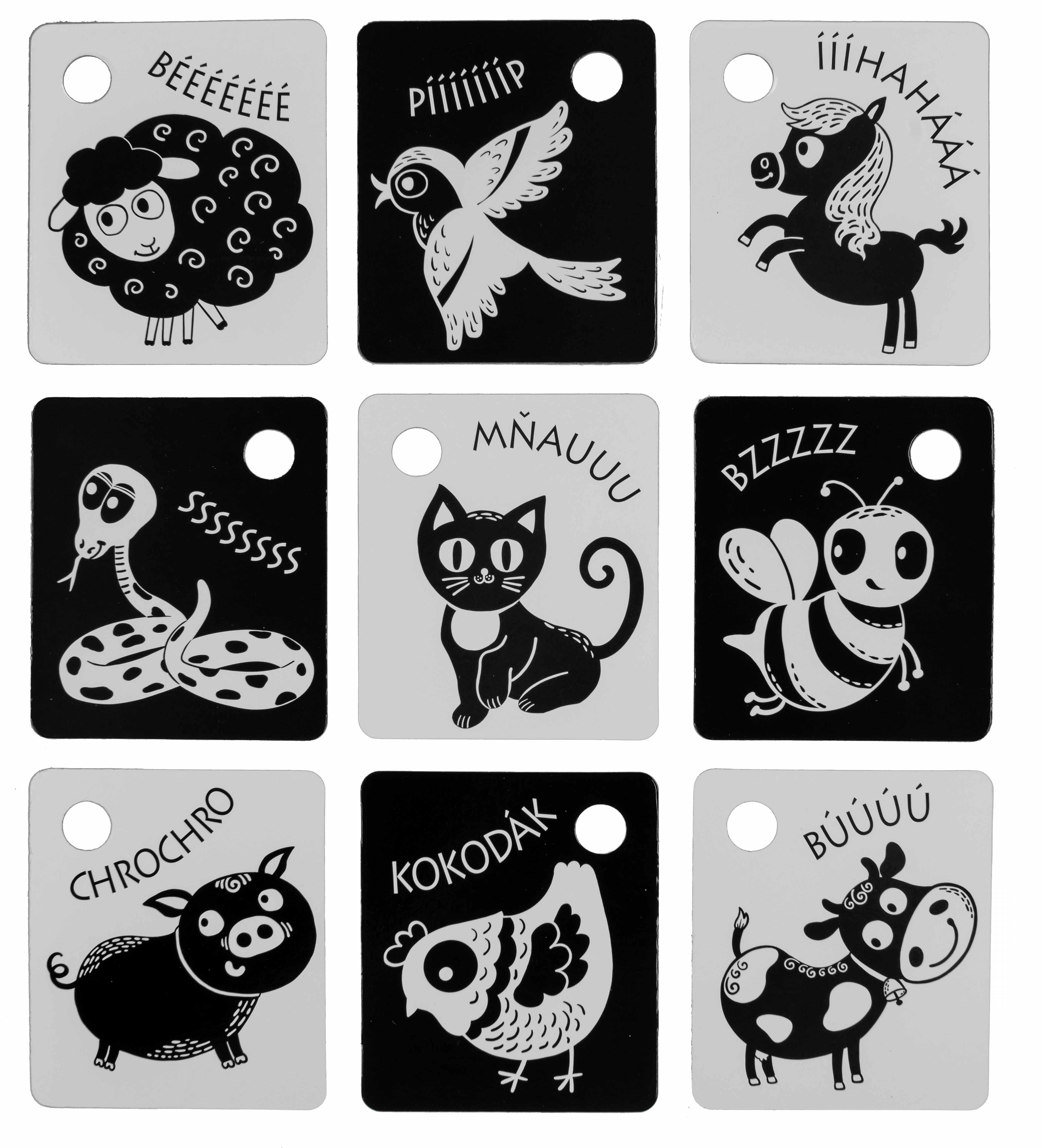 Kartičky jsou baleny po 9 kusech, vyrobeny z českých materiálů. V každé kartičce je otvor pro zavěšení. Součástí balení je plastový kroužek. Tyto kartičky zvyšují schopnost a podněcují dětskou přirozenou zvídavost, rozvíjejí dětskou motoriku, poznávání zvířátek.