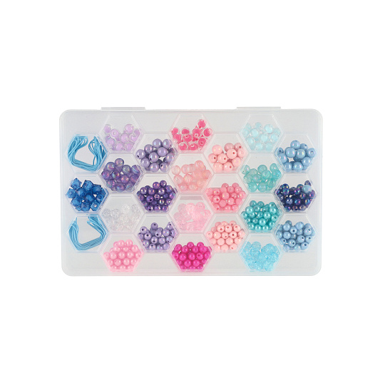 Korálky plastové barevné se šňůrkou v plastové krabičce 20x16,5cm